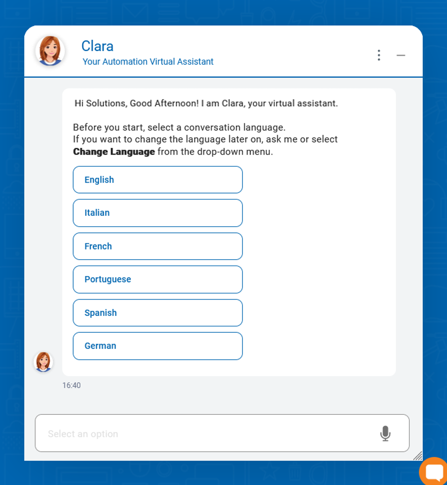 If you enable Clara language support, the first time you enter the chat interface Clara asks you to select a conversation language from the language set defined during the configuration steps (see Configuring language support).