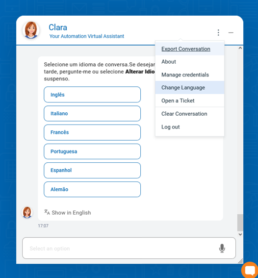 You can change the conversation language later on, by selecting Change Language in the drop-down menu of Clara chat window.