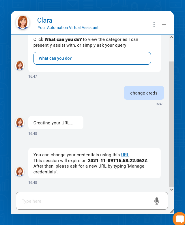 Moreover, when you ask Clara to run actions on your target environment but your credentials are not set or not valid, Clara alerts you and provides the link to open the User Credential Manager interface.