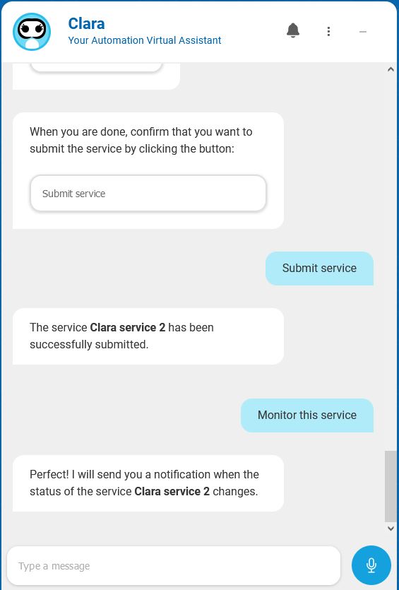Click the suggested action Monitor this service to ask Clara to monitor the service execution for you and send a notification when the service status changes.
