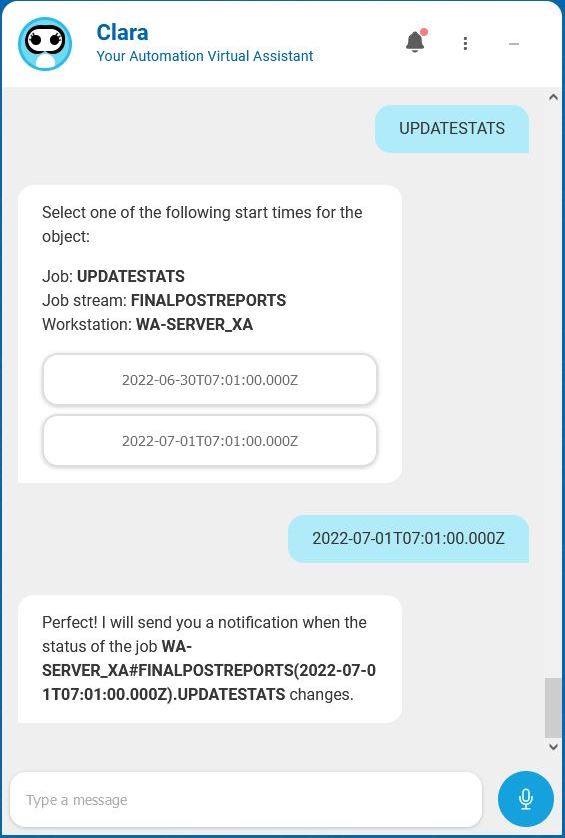 Some steps of the above conversation might be skipped by Clara if, based on the entity recognition process, she is already aware of the job stream or workstation name.