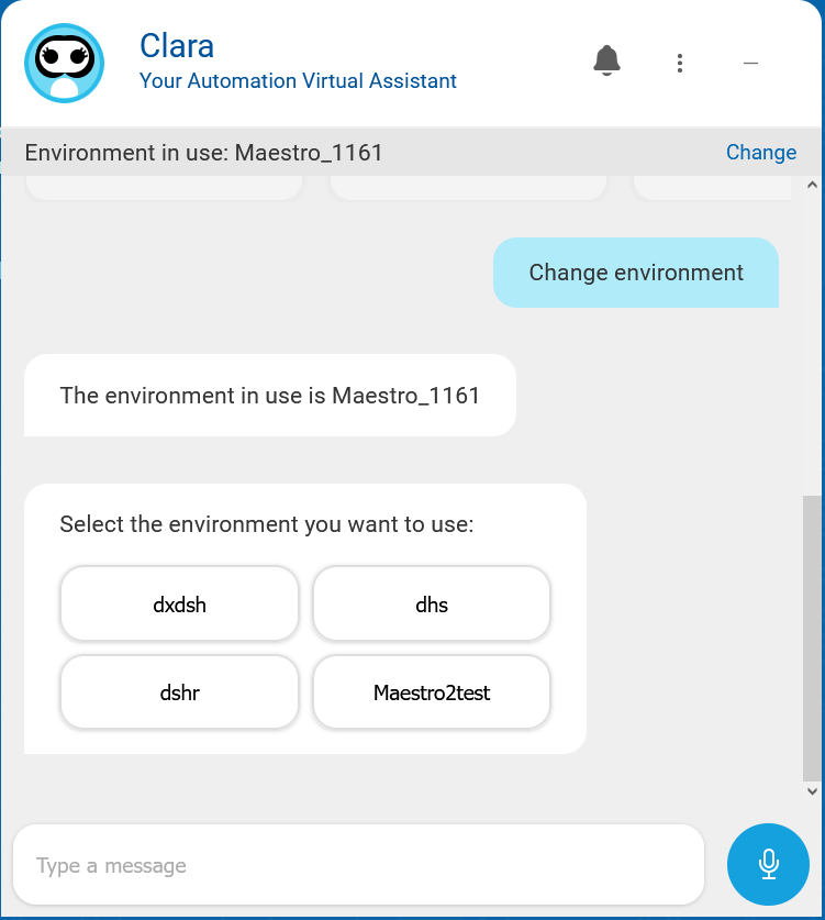From Clara V2.0.0.2, the support of multiple environments is available: once Clara Administrator has defined a default environment, each user, at any time, can change the environment that he wants to manage with Clara. From Clara chat window, for the enviroment currently in use, click the Change button and select a new environment. For details, see Changing the environment to work with.