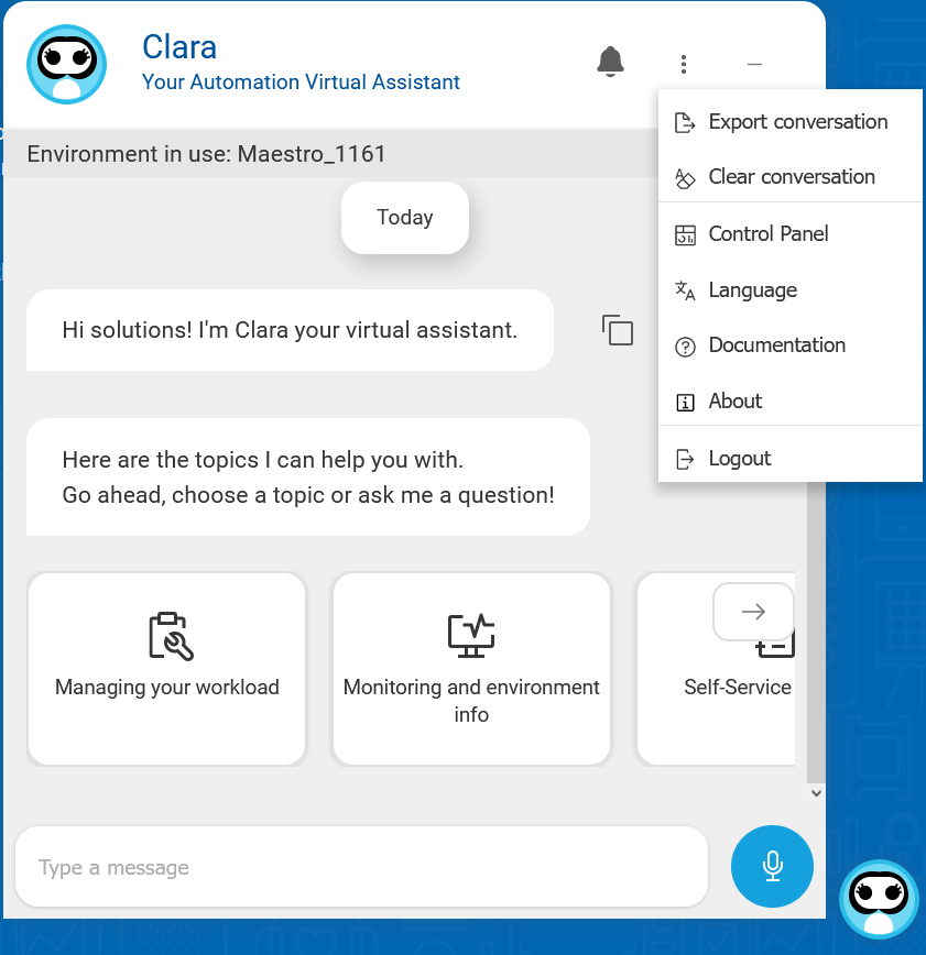 When the conversation flow about a topic completes, type "What can you do?" to view other topics Clara can assist you with.