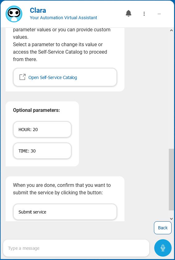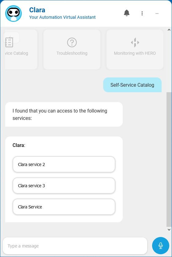 When you select the Self-Service Catalog action, Clara shows all the services available in the Self-Service Catalog. If you have both new and old Self-Service Catalogs coexisting in your Workload Automation environment, Clara will show the available services all together in the same way, without specifying the catalog name.