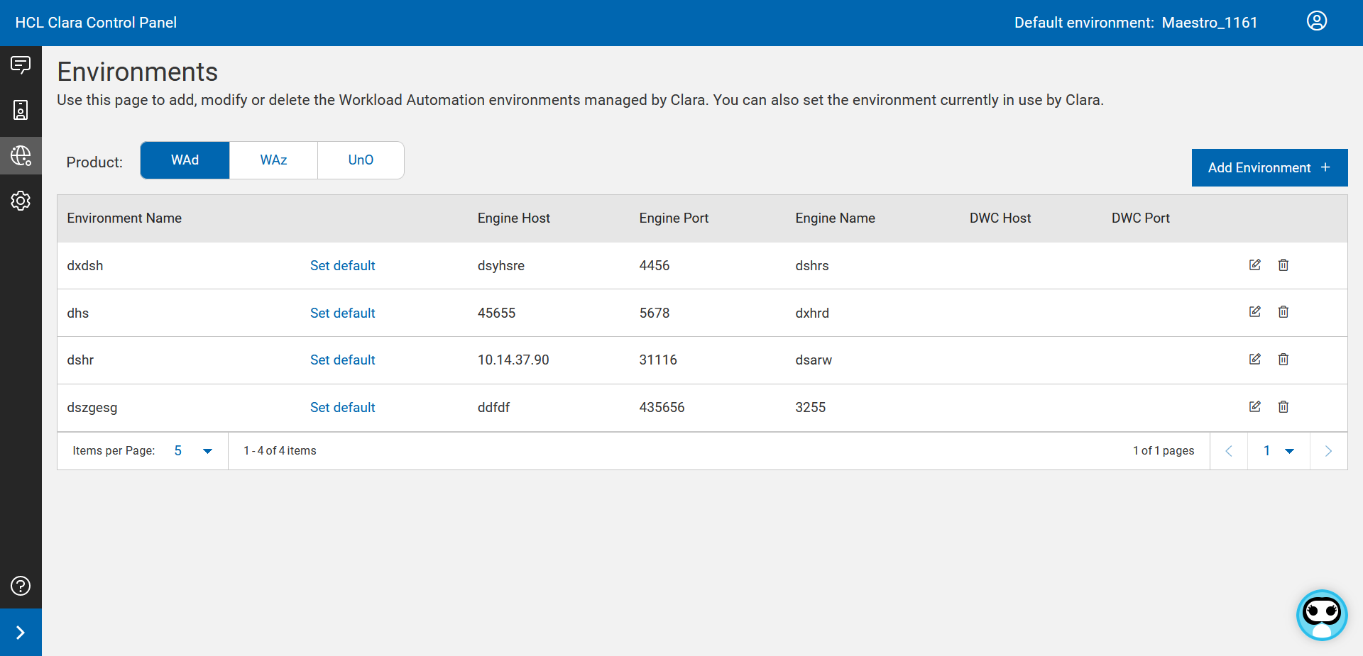 WAd table, showing the environments available for HCL Workload Automation (WAd).