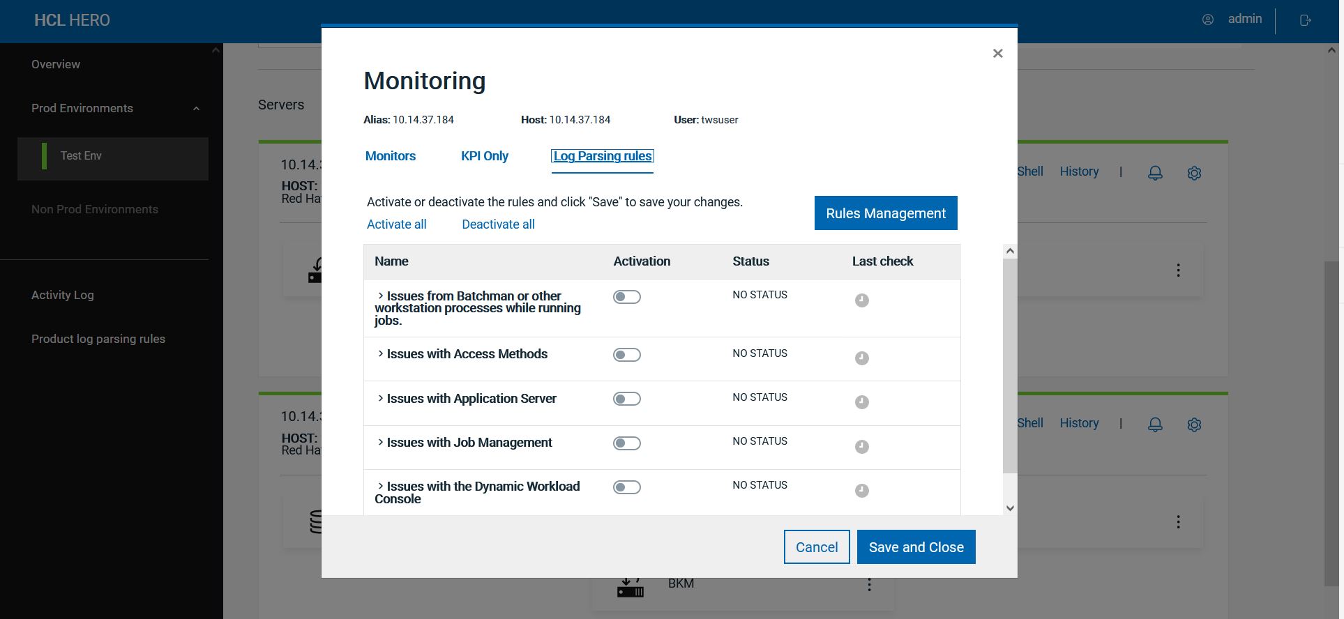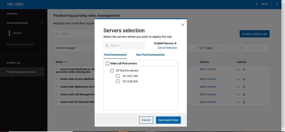 You can activate each rule on one or multiple servers by clicking Select Servers. You can also select all servers in PROD or OTHER type environments with a single check mark.