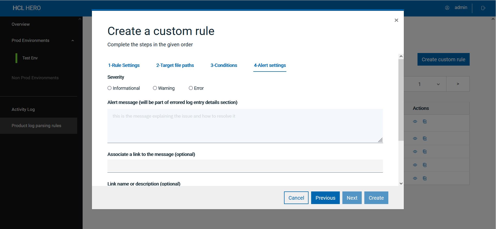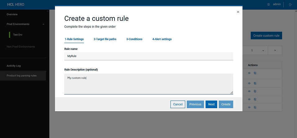 On the Log Parsing main page, click the button Create custom rule and complete the steps in the given order.