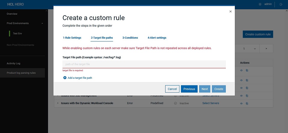 In the Target file paths tab, specify the file path (one or more) for the log file(s) that you want to monitor in the file system.