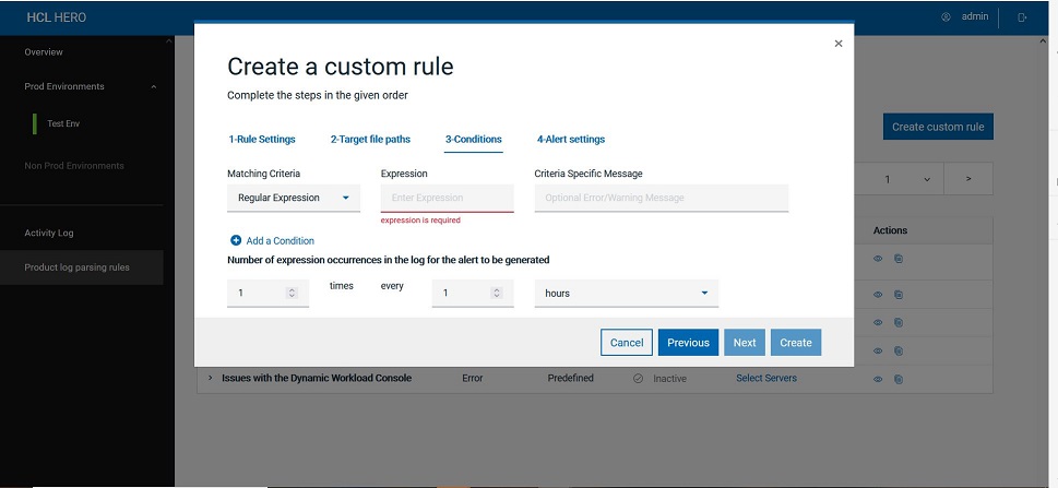 In the Conditions tab, specify one or more expression(s) that you want to match inside log files, the related matching criteria(s) (if regular or wildcard based), and the criteria specific error or warning message (optional).