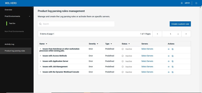 Here you can find predefined log parsing rules provided by HCL, that cover the most common issues with Workload Automation. Predefined rules can be viewed, or duplicated to obtain custom rules. Custom rules can be viewed/edited, duplicated, or deleted. With custom rules you can monitor any log file in your file system, not only WA log files.