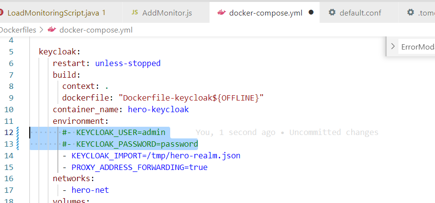 Edit the docker-compose.yml file and comment out the KEYCLOAK_USER and KEYCLOAK_PASSWORD parameters, like in the following example: