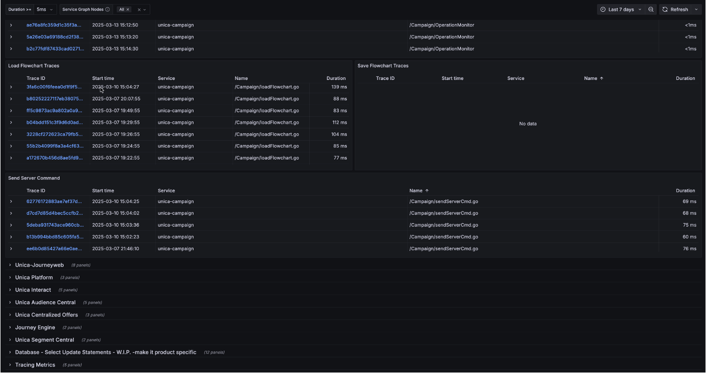 kubectl exec -it <platform-pod-name> -- bashcd /docker/unica/Tomcat_platform/apache/binvi setenv.shExample configuration:export JAVA_HOME=/docker/unica/jre export PATH=/docker/unica/jre/bin:/usr/local/sbin:/usr/local/bin:/usr/sbin:/usr/bin:/sbin:/bin:/docker/unica export OTEL_EXPORTER_OTLP_LOGS_ENDPOINT=http://otel-collector.monitoring.svc.cluster.local:4318/v1/logs export OTEL_EXPORTER_OTLP_METRICS_ENDPOINT=http://otel-collector.monitoring.svc.cluster.local:4318 export OTEL_EXPORTER_OTLP_TRACES_ENDPOINT=http://otel-collector.monitoring.svc.cluster.local:4318/v1/traces export JAVA_OPTS="-javaagent:/docker/unica/opentelemetry-javaagent-2.11.0.jar \ -Dotel.metrics.exporter.prometheus.port=80 \ -Dotel.exporter.otlp.protocol=grpc \ -Dotel.exporter.otlp.protocol=http \ -Dotel.javaagent.debug=true \ -Dotel.exporter.otlp.grpc.max_reconnect_delay=10s \ -Dotel.exporter.otlp.grpc.max_receive_message_size=16777216 \ -Dotel.exporter.otlp.grpc.max_send_message_size=16777216 \ -Dotel.exporter.otlp.endpoint=http://otel-collector.monitoring.svc.cluster.local:4317 \ -Dotel.metrics.exporter.prometheus.host=hcl-prometheus-server.monitoring.svc.cluster.local \ -Xms1024m -Xmx2048m \ -DUNICA_PLATFORM_CACHE_ENABLED=false \ -Dfile.encoding=UTF-8 \ -DENABLE_NON_PROD_MODE=true \ -Dclient.encoding.override=UTF-8 \ -Dplatform.home=/docker/unica/Platform"Otel Dashboard