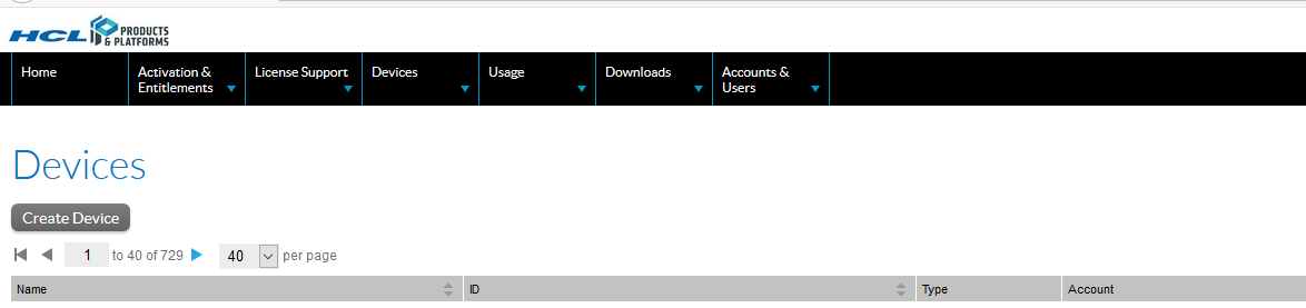 Your list might be empty if this is your first purchase from HCL Products and Platforms, or you might see a list of devices that were previously created for your account. You may optionally use one of these previously created devices or create a new device for your recently purchased entitlements. Click on “Create Device” for creating a new device.