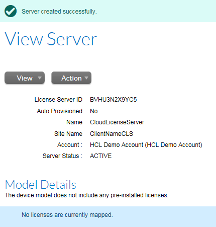 You will get a response screen that confirms the Server was created. Record the License Server ID, as this will be used during the install of your purchased software to talk with the Cloud License Server.
