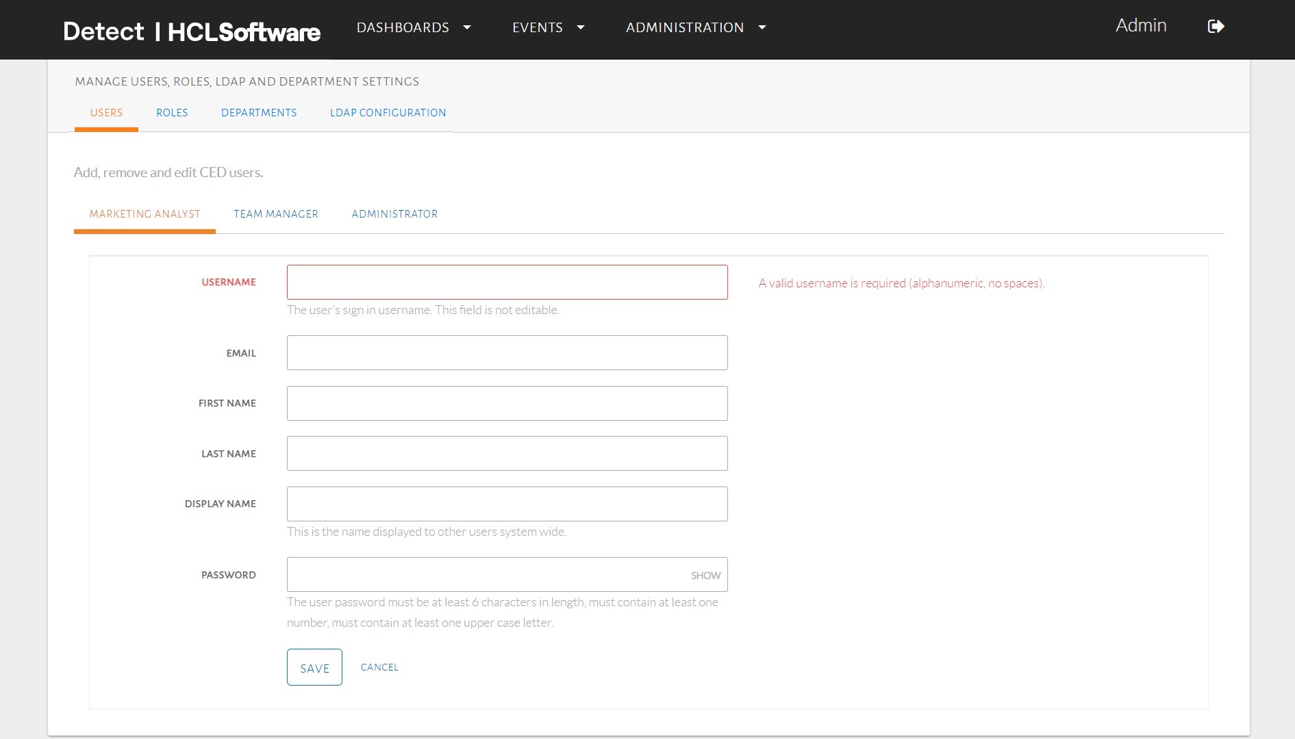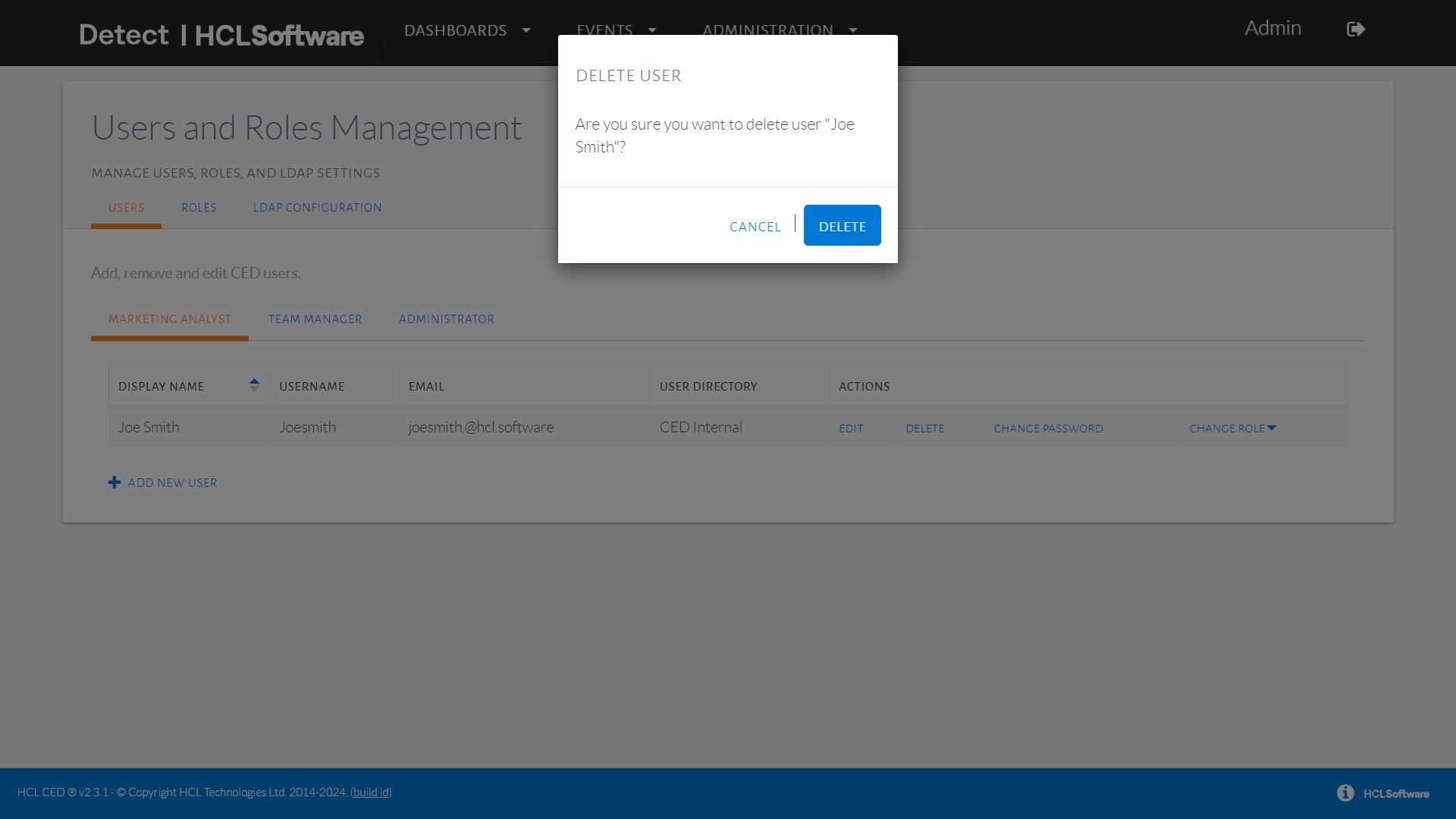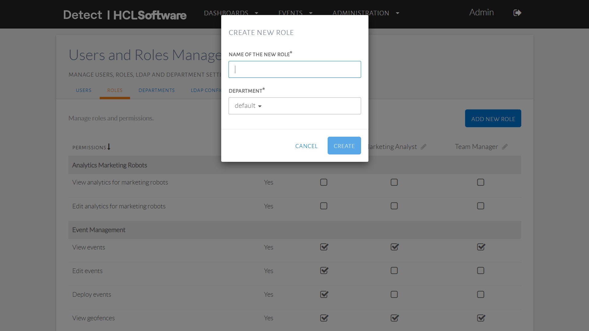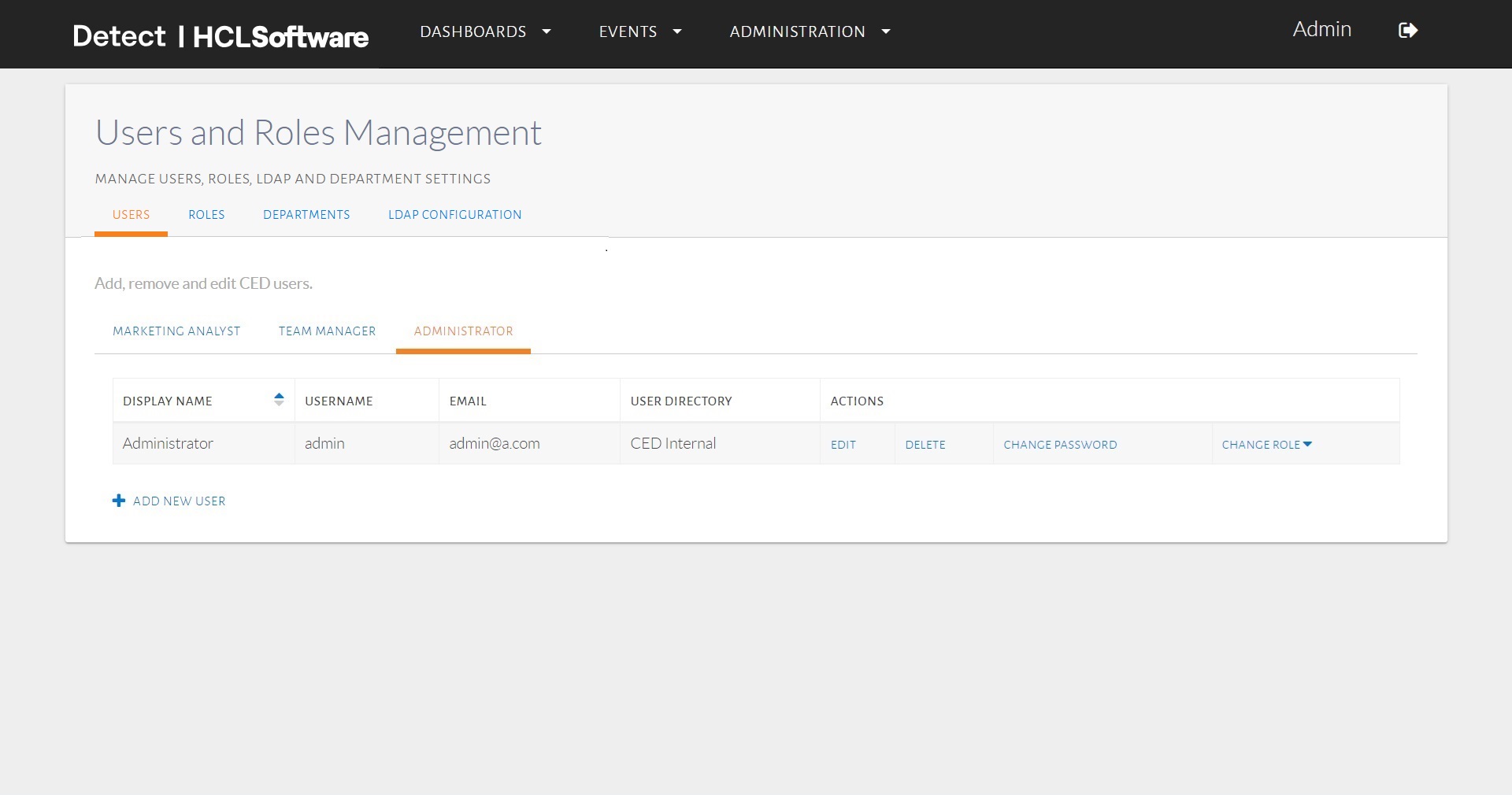 This page explains how to manage users and roles in HCL Detect, including adding new users, creating and assigning roles, organizing departments, and configuring LDAP authentication.