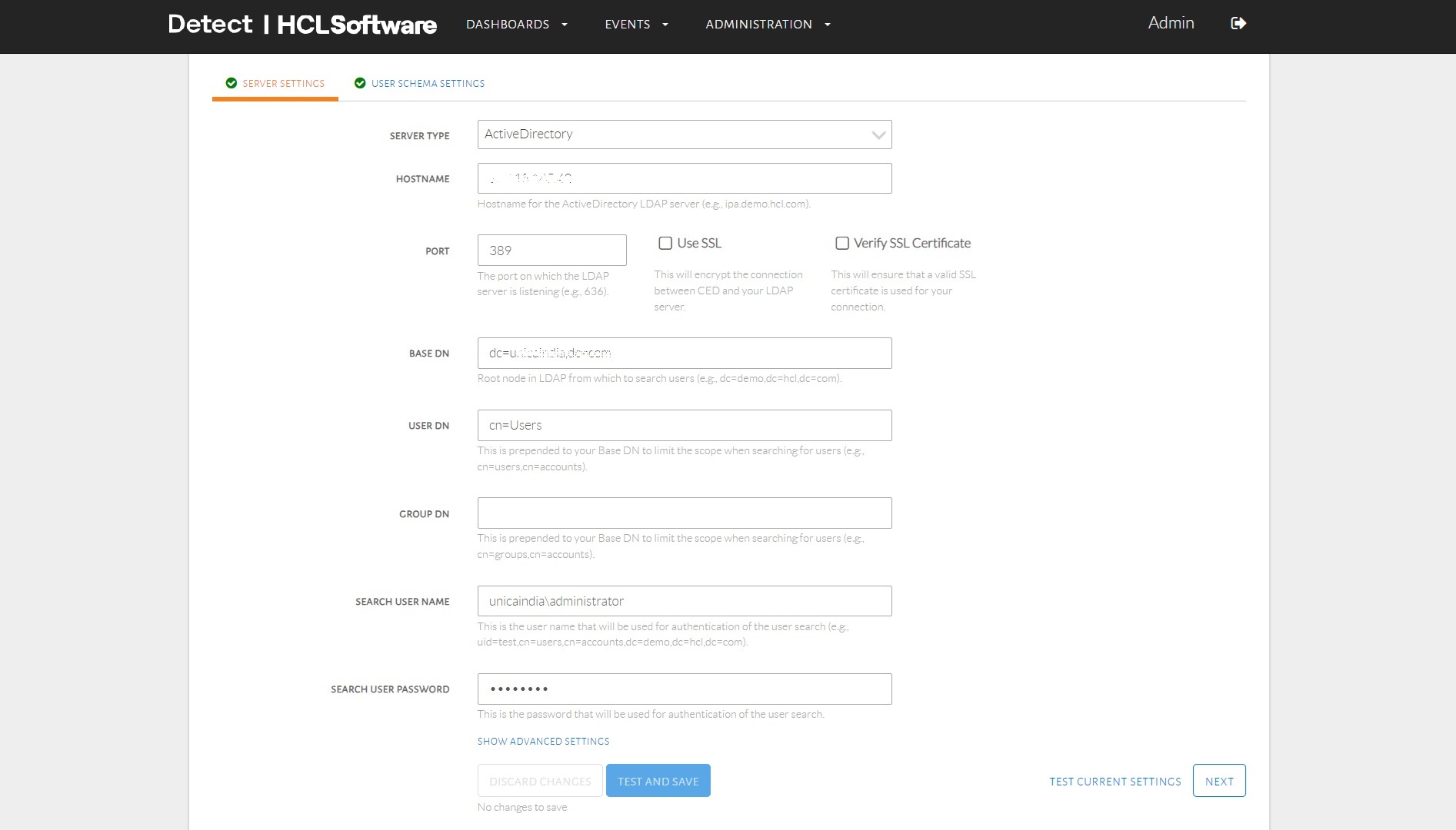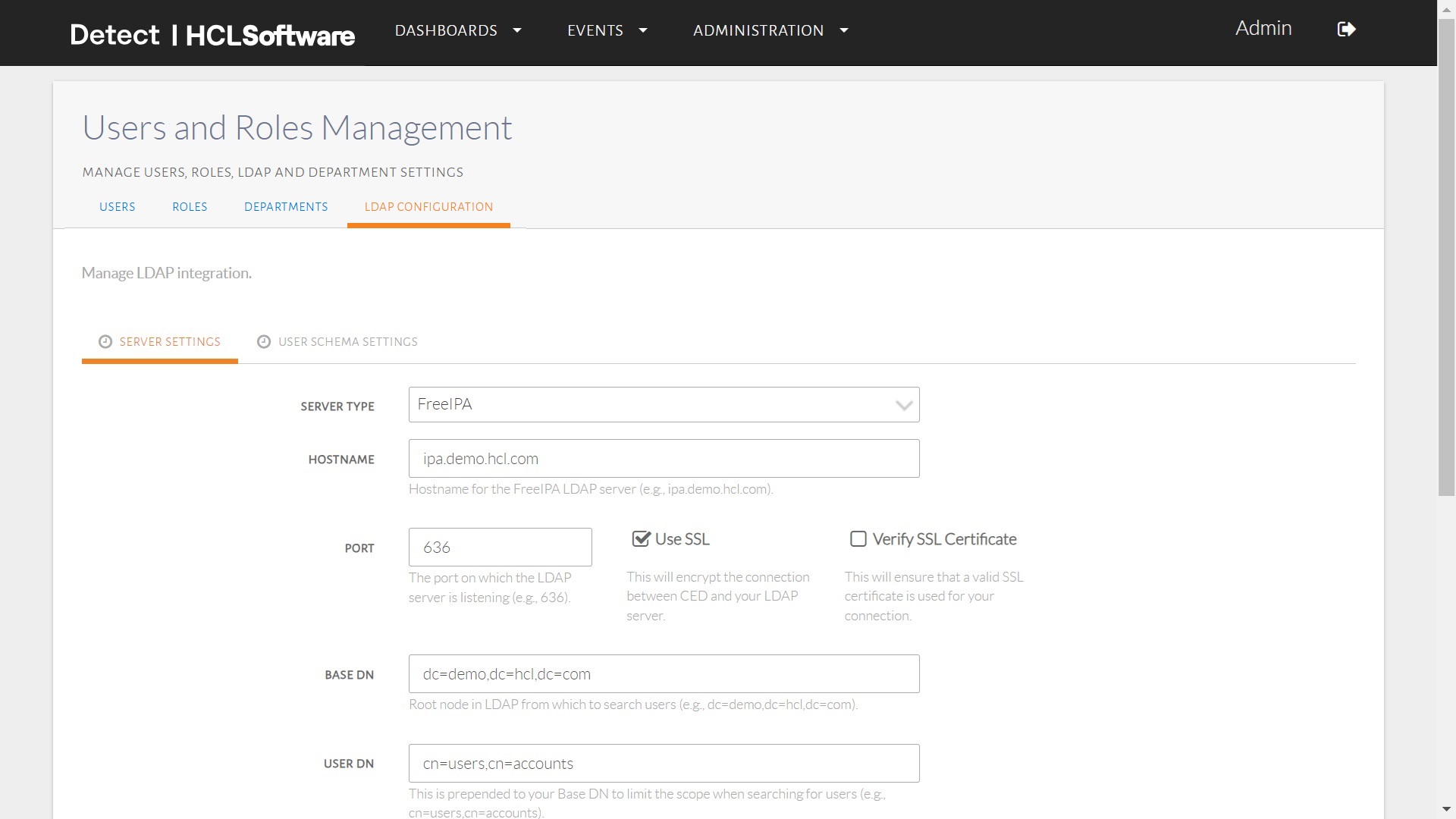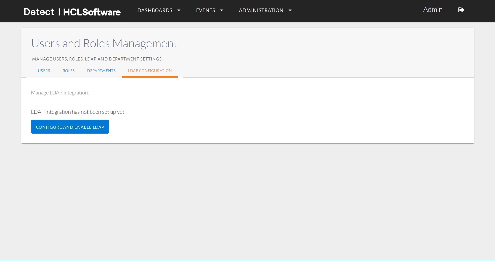 HCL Detect supports optional LDAP-based authentication. Configure LDAP settings through the LDAP Configuration tab in the navigation bar.