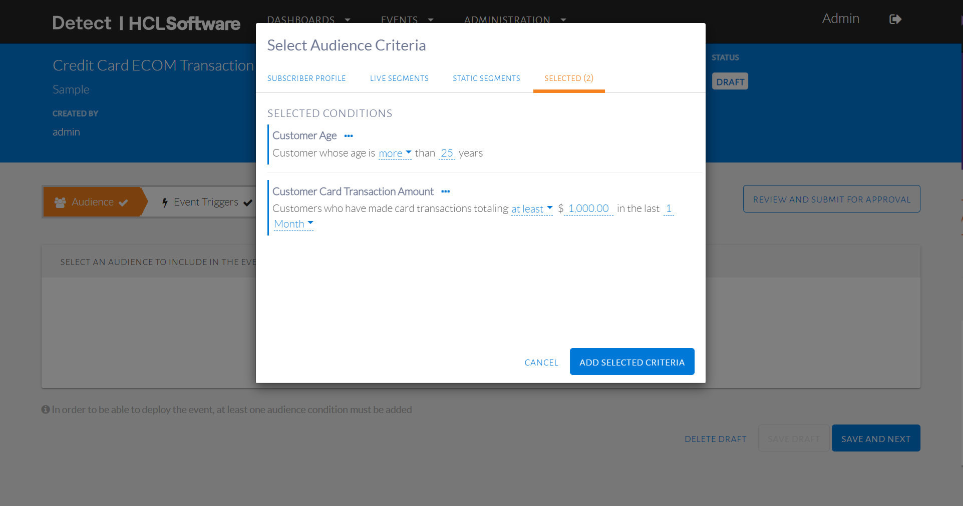 - Select name of live segment and click Add Selected Criteria.