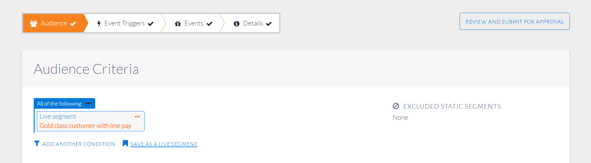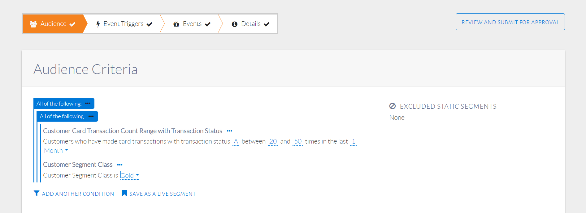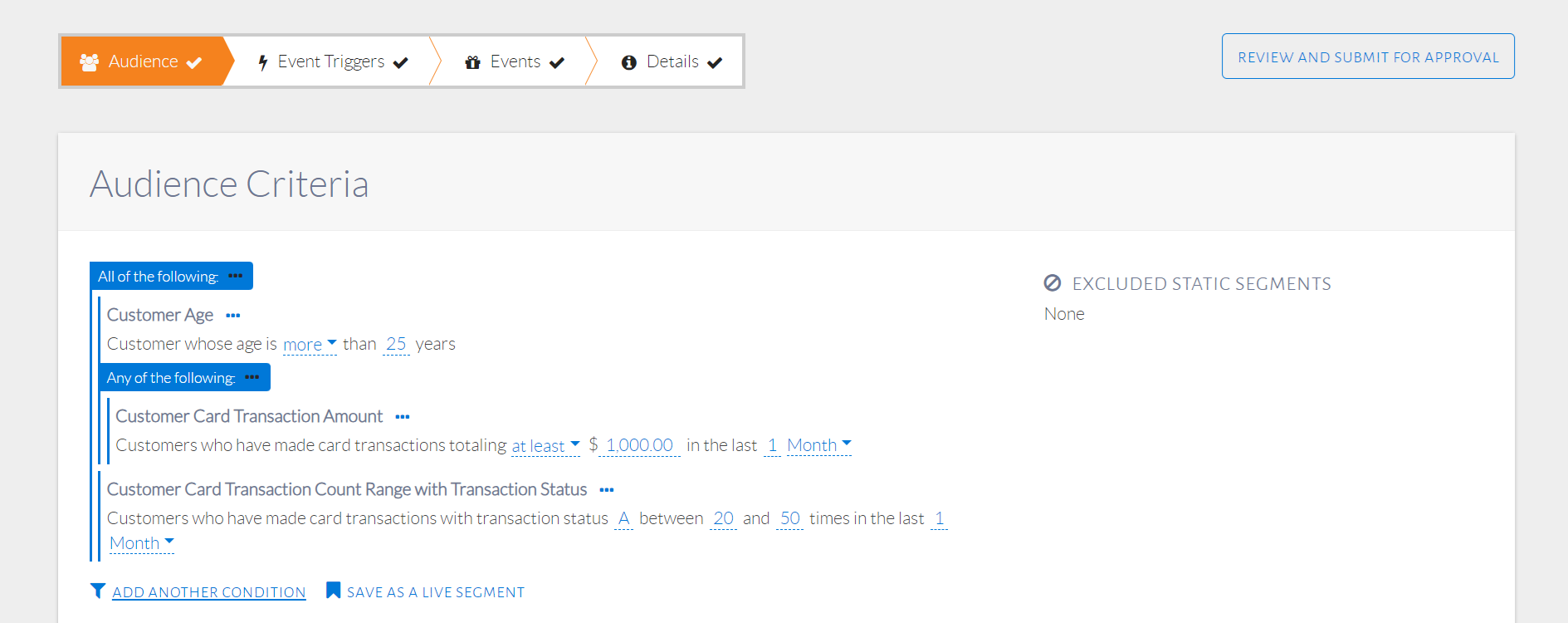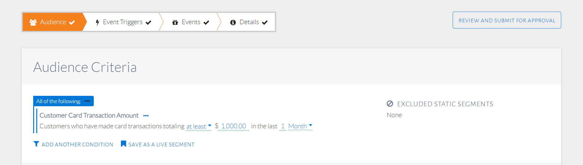 A static segment is a saved set of customers. It is different from a live segment in the sense that a live segment saves audience conditions, which are the basis of selecting customers as part of that segment. A static segment, on the other hand, saves specific customers. These specific customers can be chosen through the events step of configuration. Once a customer is saved in a static segment, they will always be part of that static segment until explicitly removed by the user, unlike with live segments.