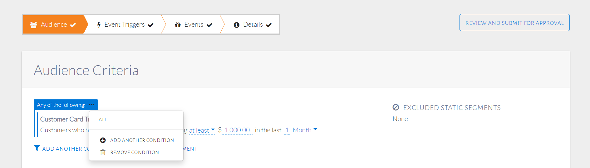 Recall the previous audience condition setup which included Married customers with at least $1,000 spent in the last 1 month. Set up those conditions. Click the ellipsis button beside an individual condition to see options that convert it into an ANY condition group or remove the individual condition, as seen in the image below. Alter the condition to ANY.