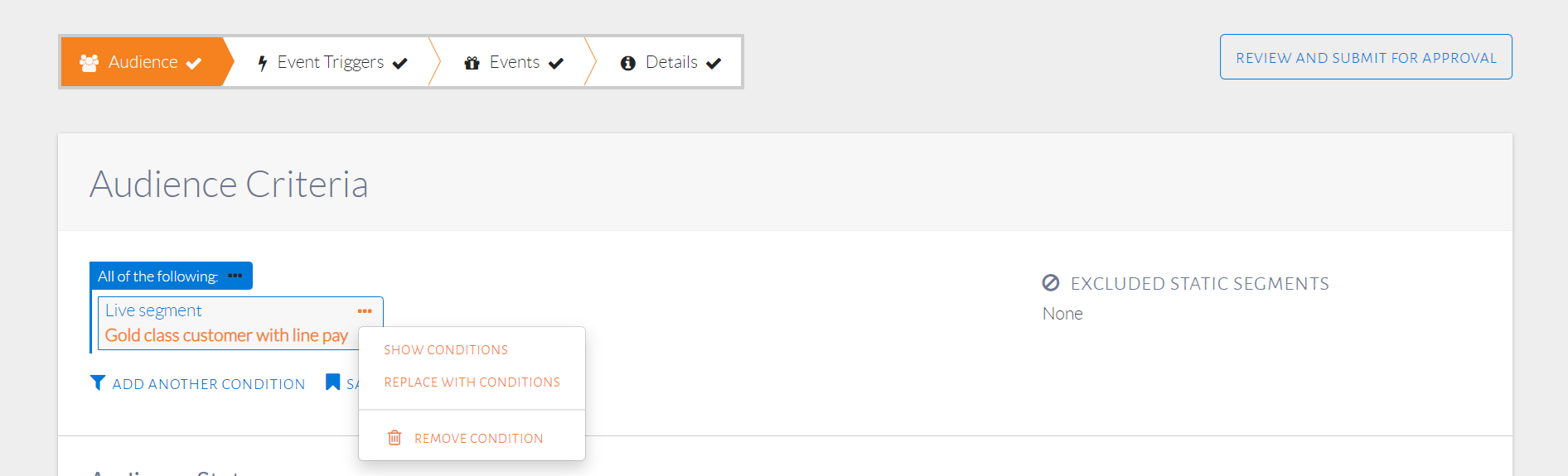 This can be done by selecting the static segment as our audience condition. When selecting conditions, click the Static Segments tab, as seen in the image below.