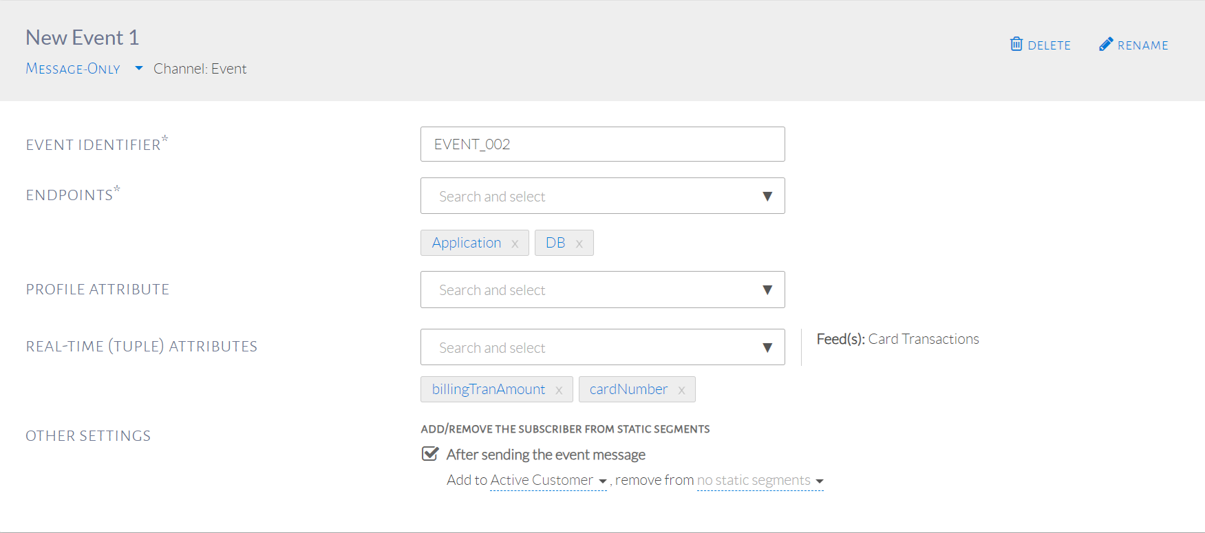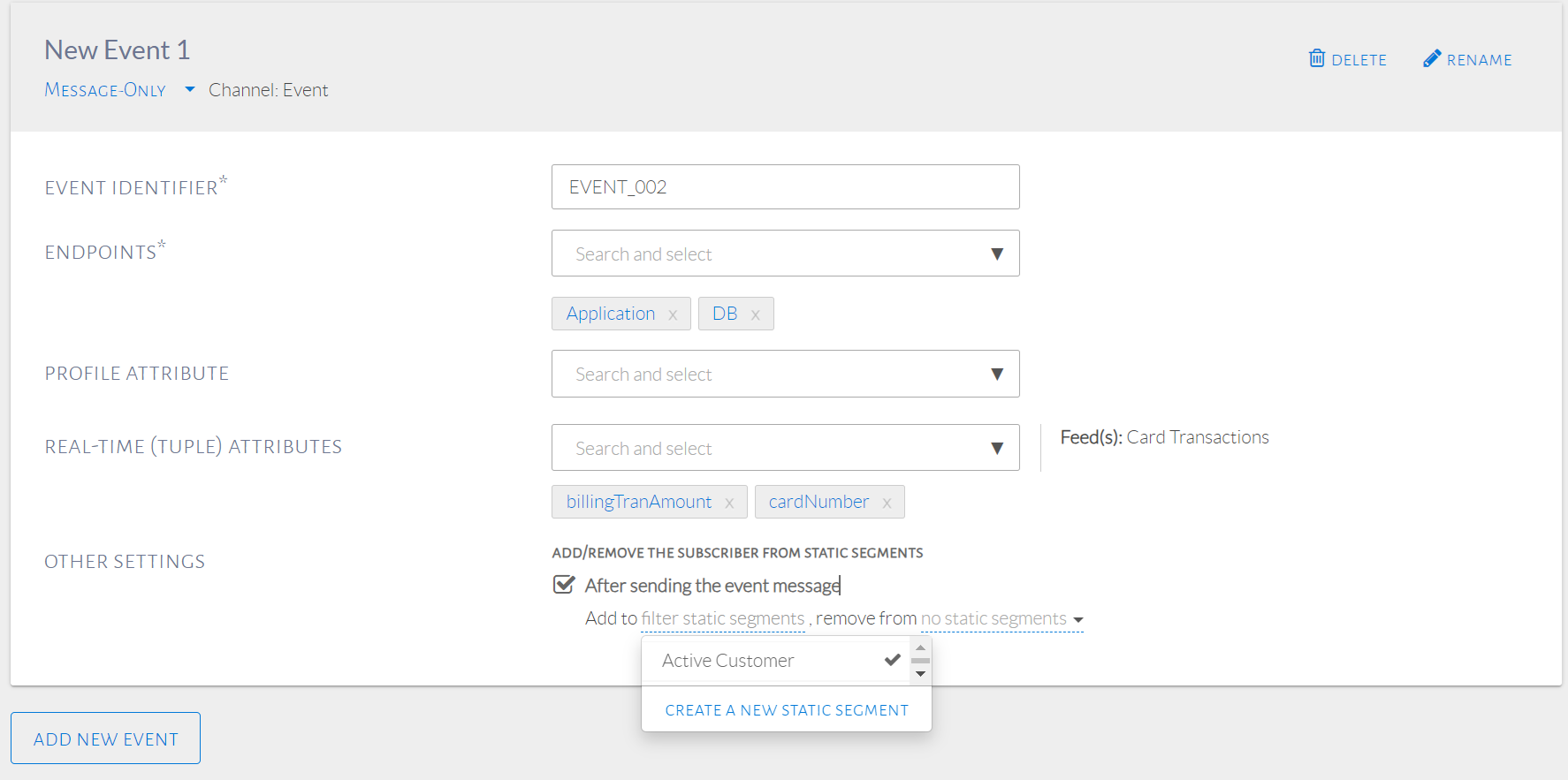 - In Events, check Add/remove the subscriber from static segments after sending the event.