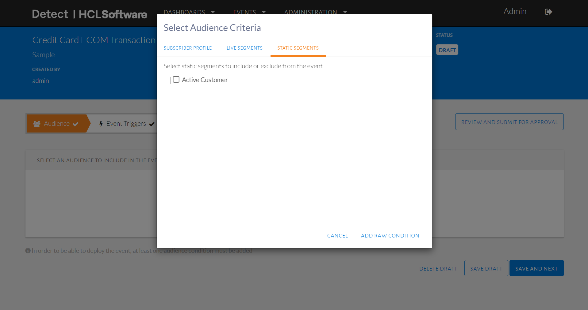 - From the Audience Criteria pop-up, click add raw condition.