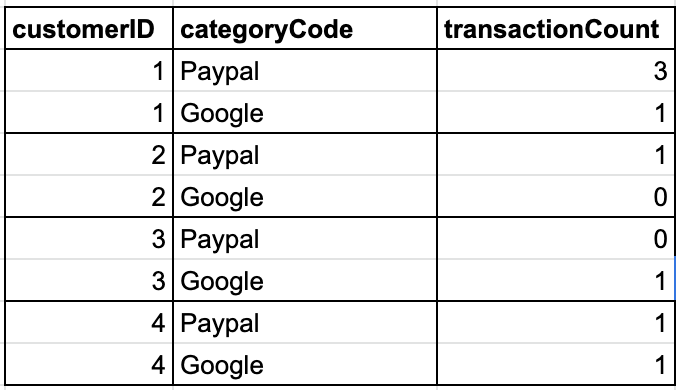 The expanded table in the image below contains information about the number of card transactions by customers for the last 1 month. CustomerID 1 and customerID 2 from the table above can be found also. CustomerID 3 with a Google transaction and CustomerID 4 with both Paypal and Google transactions are also included in the table.
