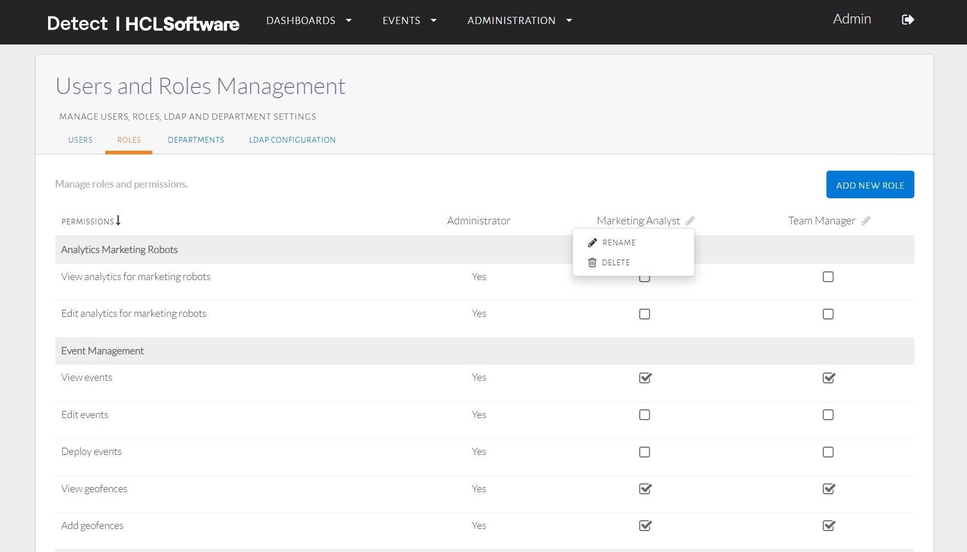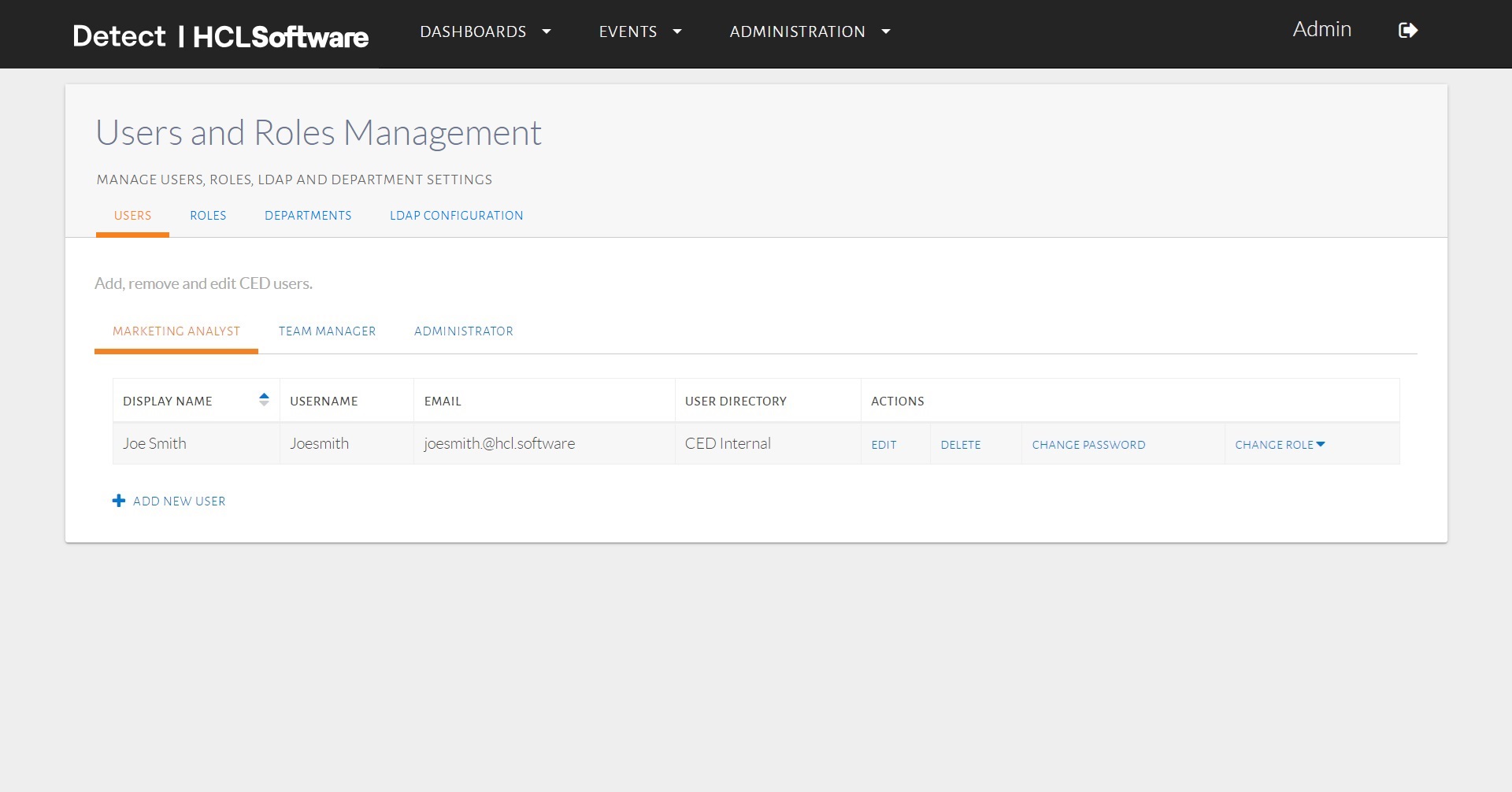 This page explains how to manage users and roles in HCL Detect, including adding new users, creating and assigning roles, organizing departments, and configuring LDAP authentication.