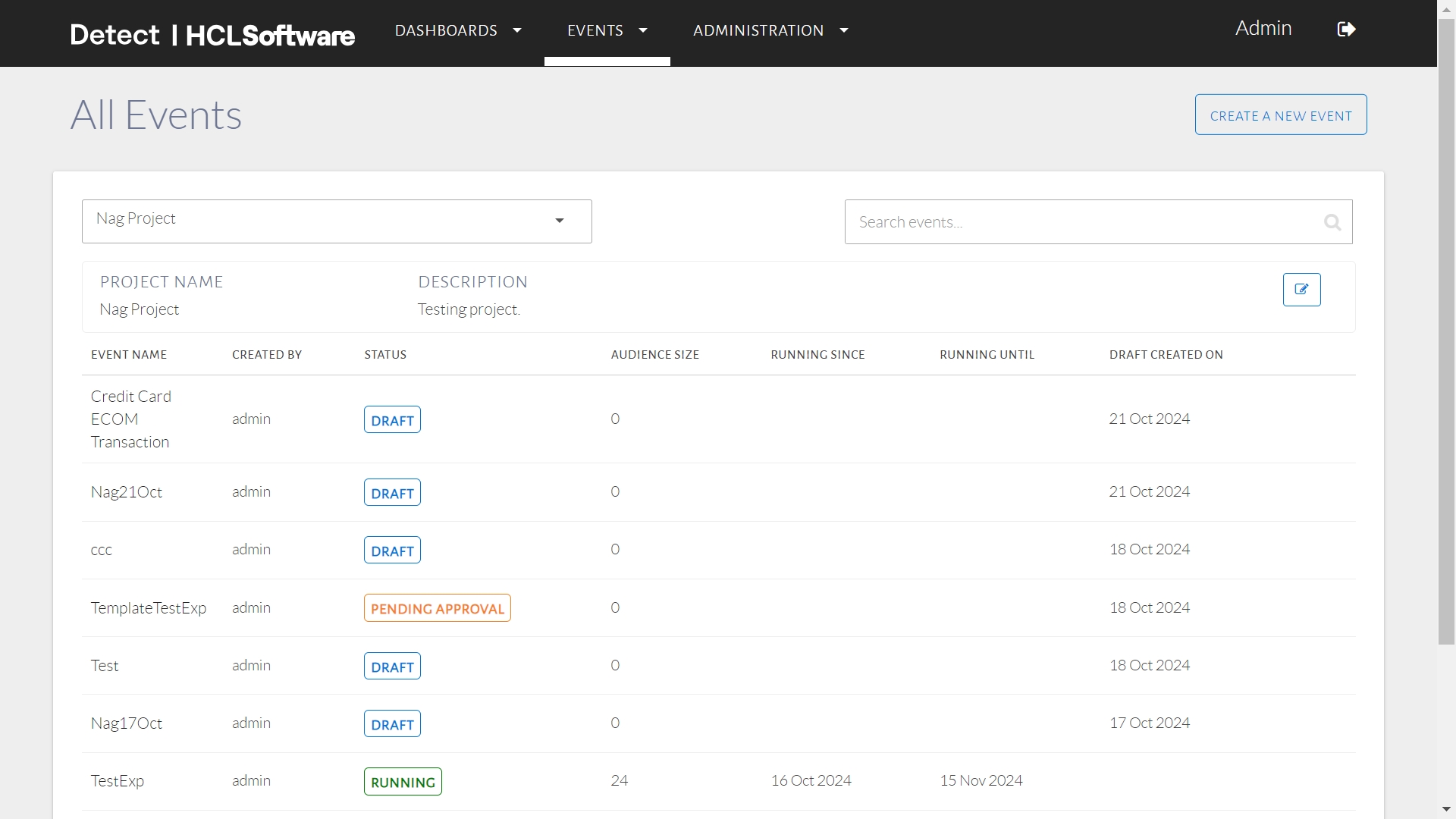 The All Events page displays the project name, project description, search option to search all events and lists all the events specific to the selected project as shown below.