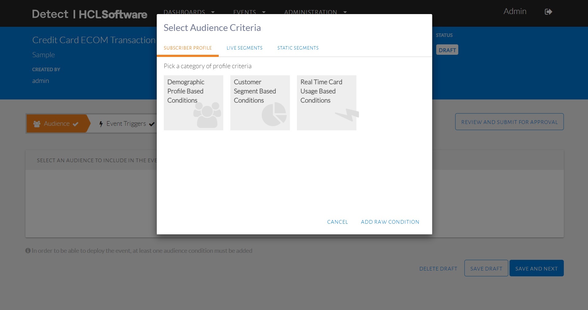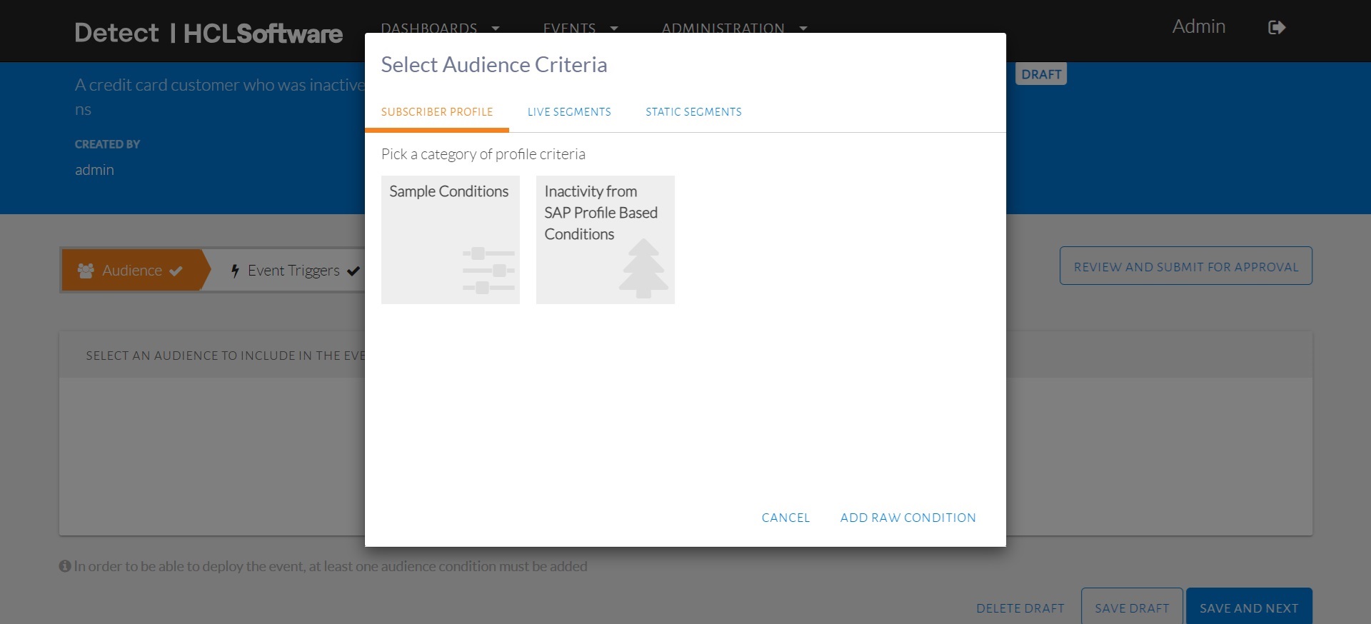 - From the Audience Criteria pop-up, click add raw condition.