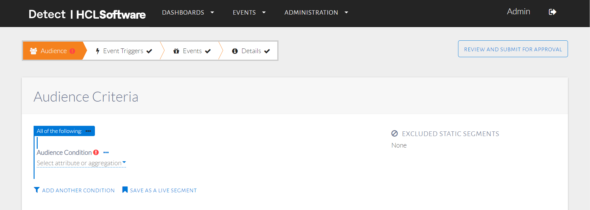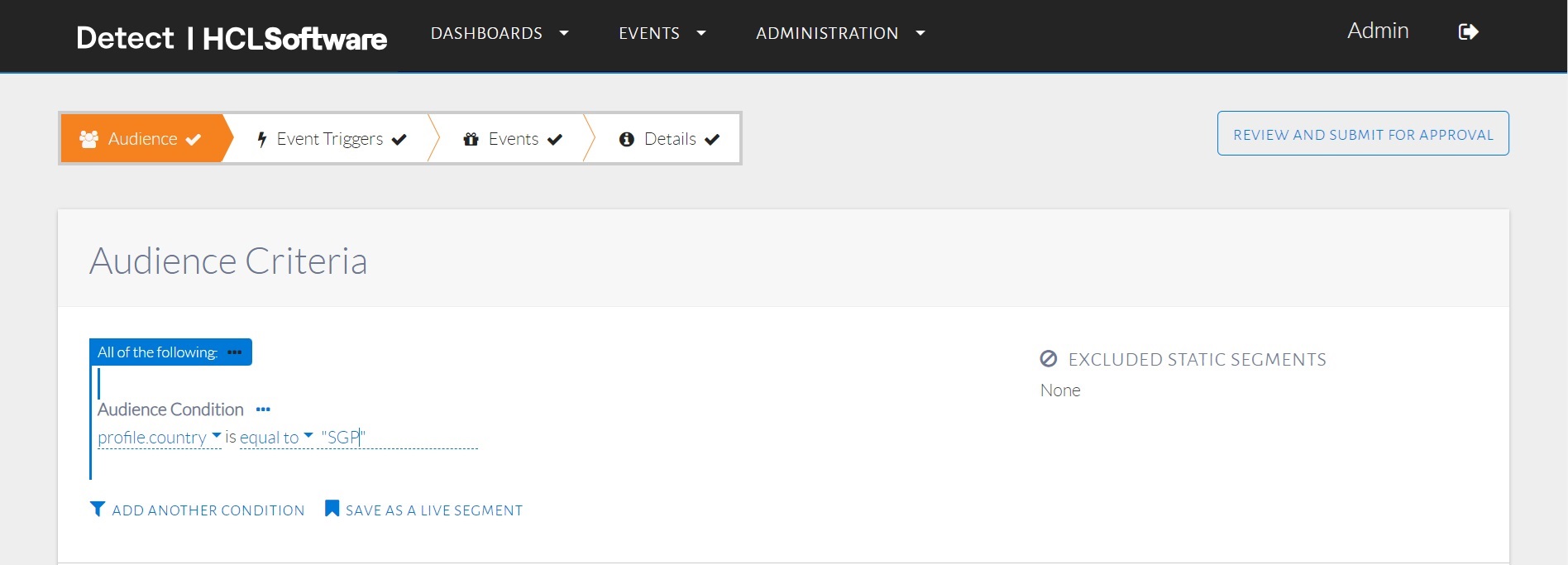 The audience conditions will be set up as seen in the image below. Click Save as a Live Segment.