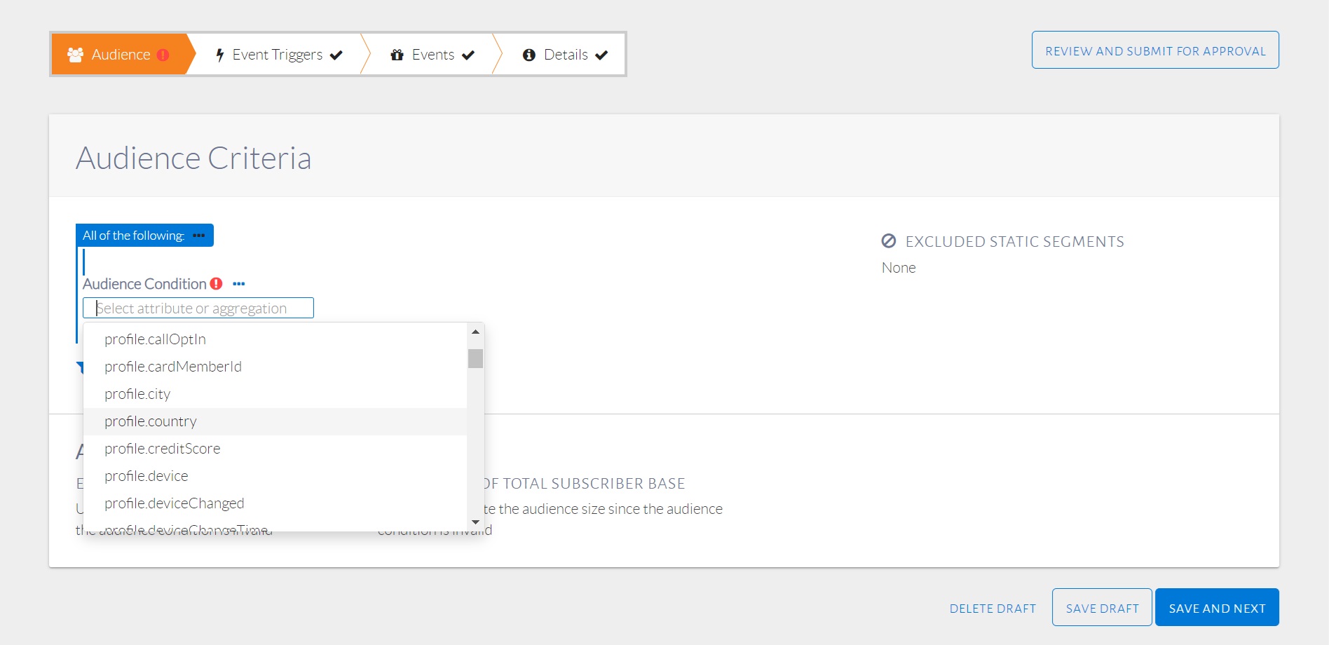 A blank audience condition will appear, as seen in the image below. Click on Select attribute or aggregation to display a list of attributes or aggregations which the user can select from. Once an attribute or aggregate is selected, the user can specify its value.