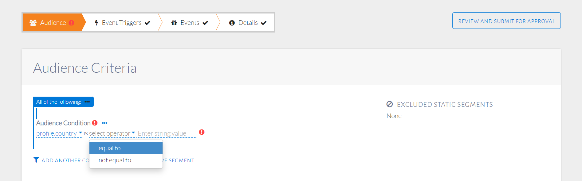 - Select name of static segment and click Add Selected Criteria.