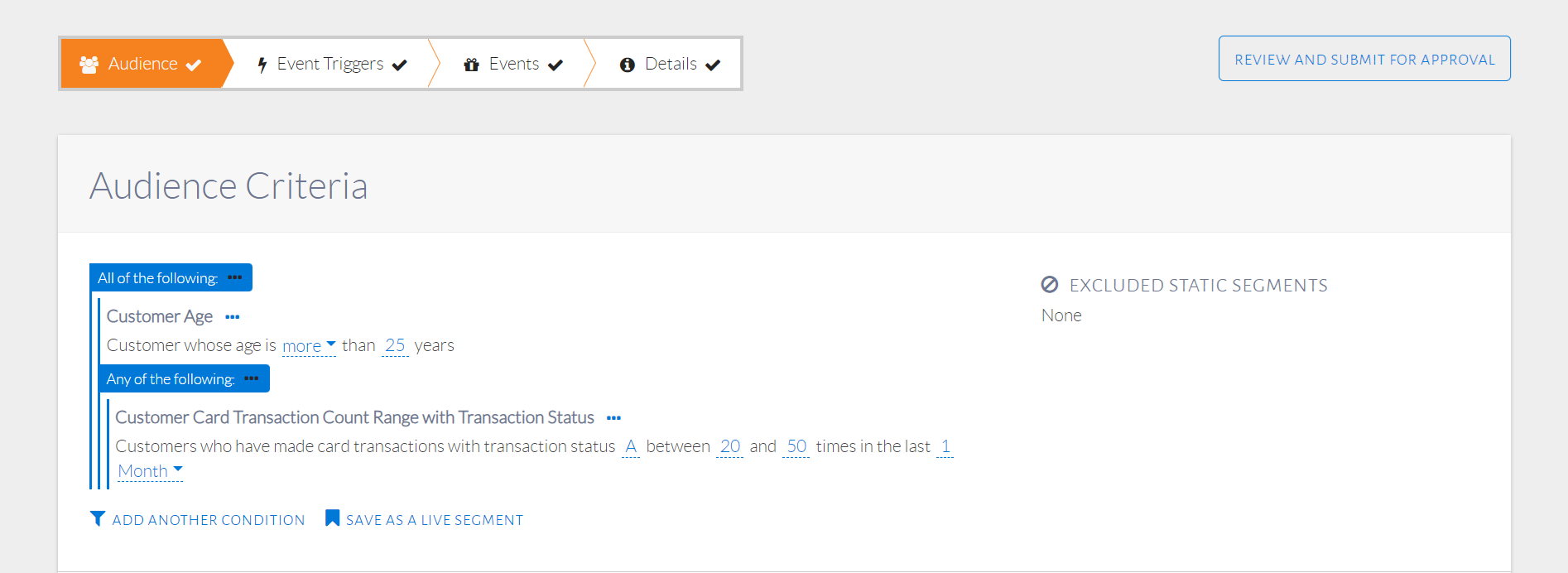 A static segment is a saved set of customers. It is different from a live segment in the sense that a live segment saves audience conditions, which are the basis of selecting customers as part of that segment. A static segment, on the other hand, saves specific customers. These specific customers can be chosen through the events step of configuration. Once a customer is saved in a static segment, they will always be part of that static segment until explicitly removed by the user, unlike with live segments.