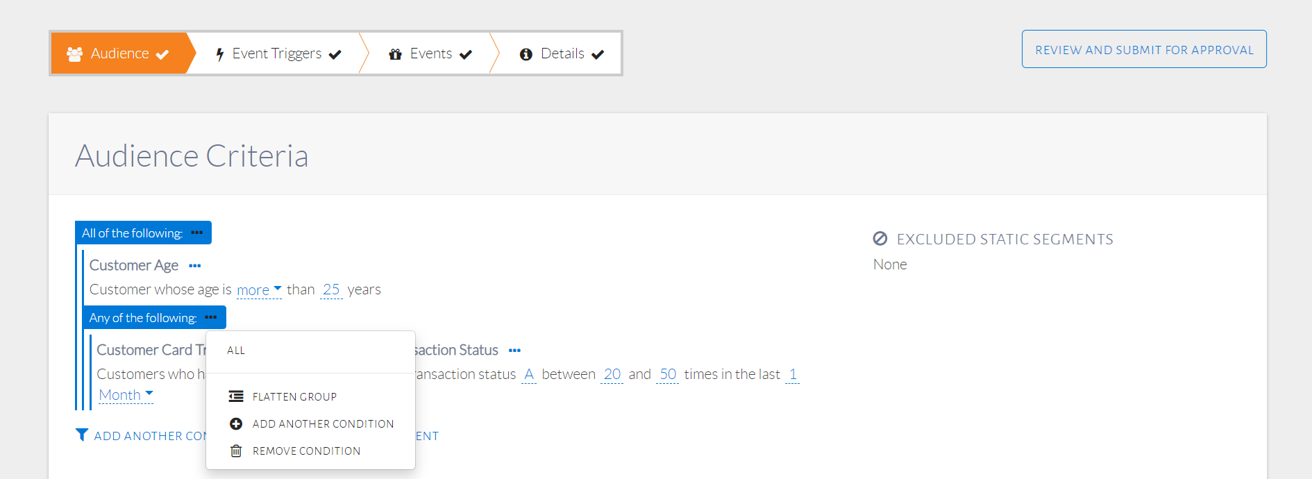 Individual audience conditions can be combined using condition groups. For the condition group All of the following, a customer must satisfy all of the statements under the condition group to be qualified as part of the audience. For the condition group Any of the following, a customer can satisfy at least one of the statements under the condition group to be qualified as part of the audience.
