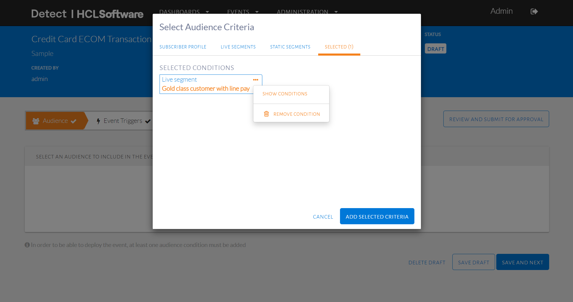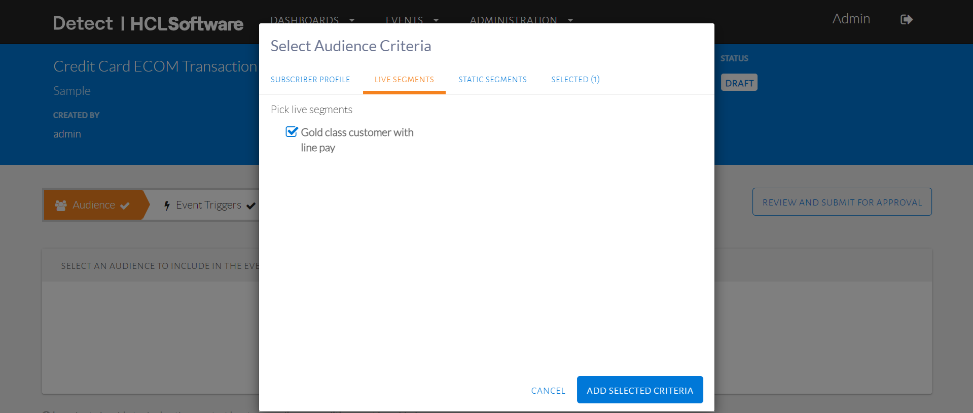 - Select name of live segment and click Add Selected Criteria.