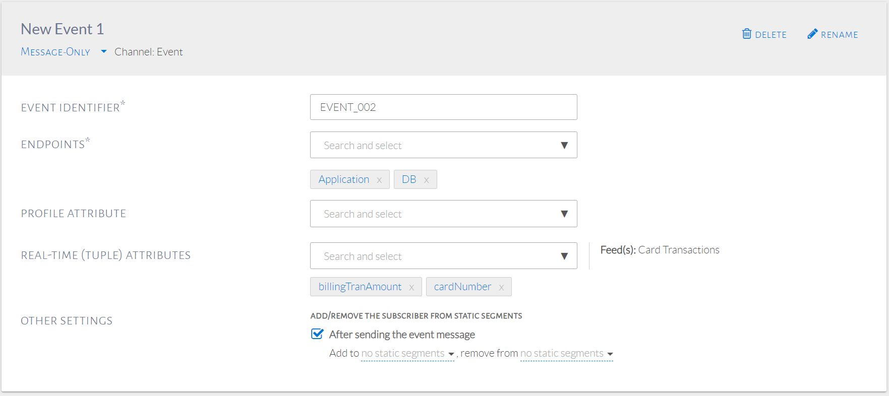 - In Events, check Add/remove the subscriber from static segments after sending the event.