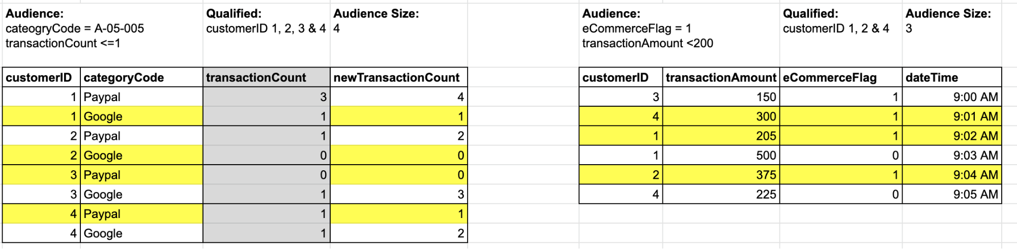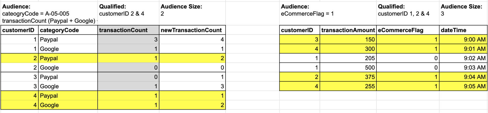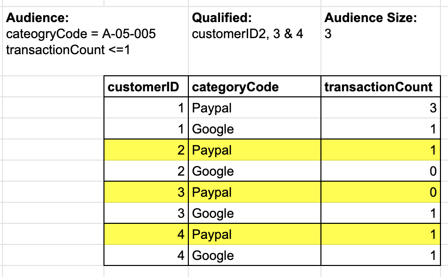 It is important to note that this audience condition computes the combined transaction count of both Paypal and Google, even if the both the categories have not been fulfilled. For example, customerID 2 has a Paypal transaction count of 2 and the Google transaction count of 0. The combined transaction count will therefore be 2 + 0 or 2, and he will qualify for the audience.