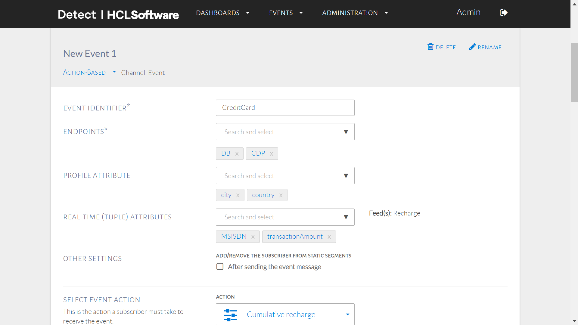 A sample screenshot shown below within an event configured in Detect where we select the attributes and populate an event identifier to push to downstream Kafka topic for Unica Journey to ingest.