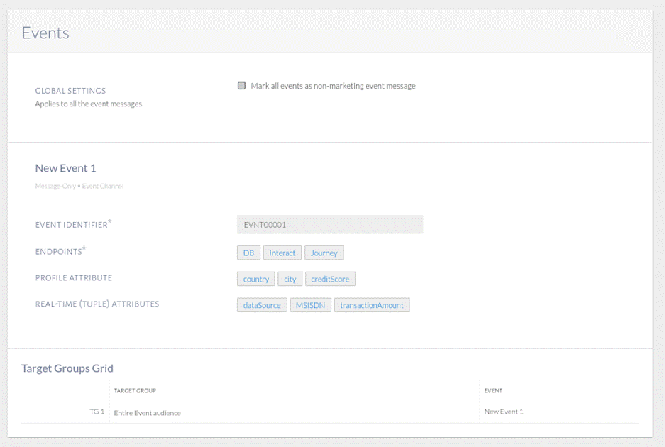 A sample screenshot shown below within an event configured in Detect where we select the attributes and populate an event identifier to push to downstream kafka topic for Unica Journey to ingest.