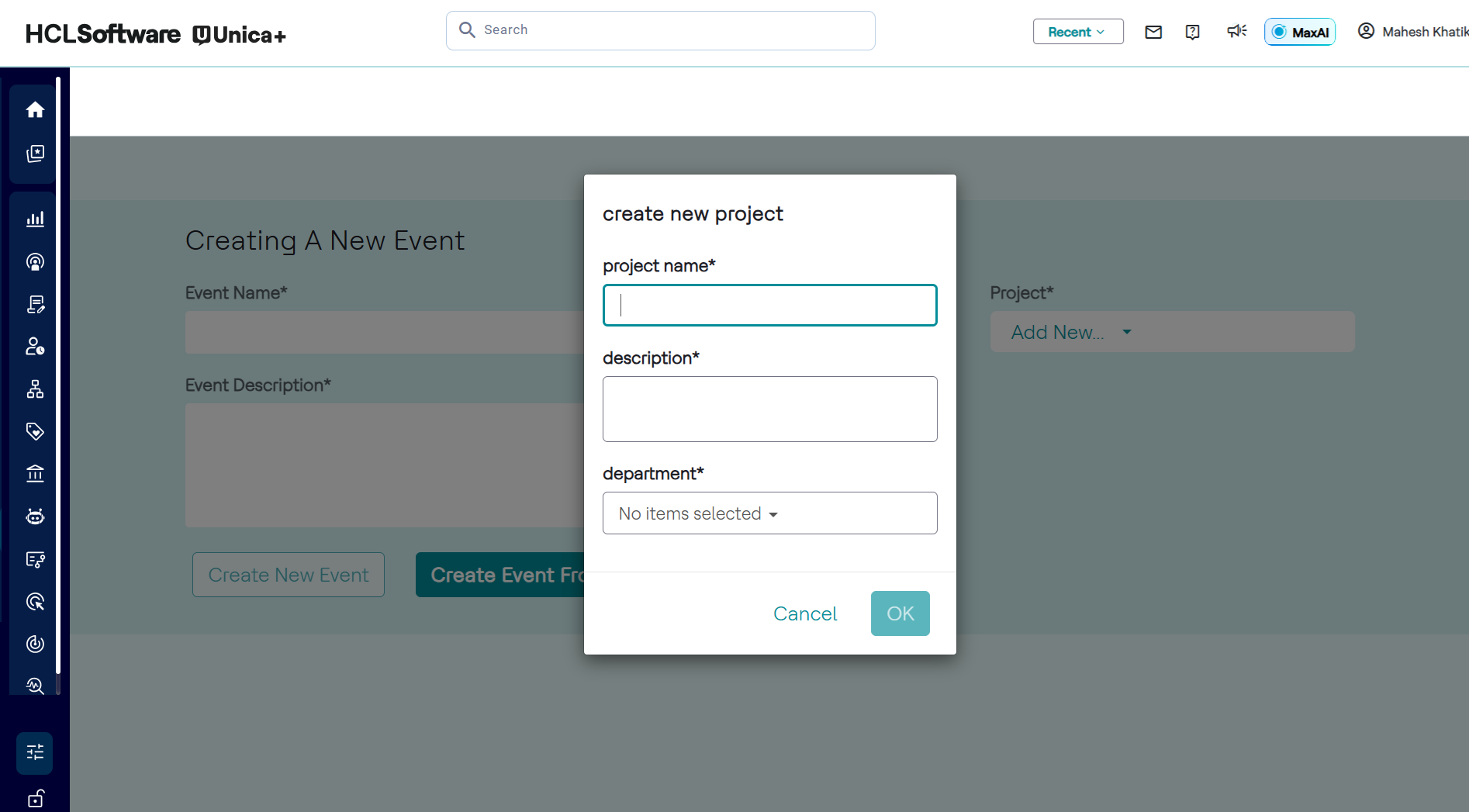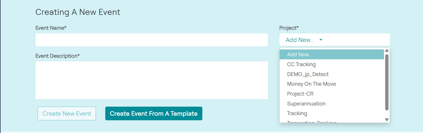 This page explains how to add a new project while creating or editing an event, using the project selection section within the event description page.