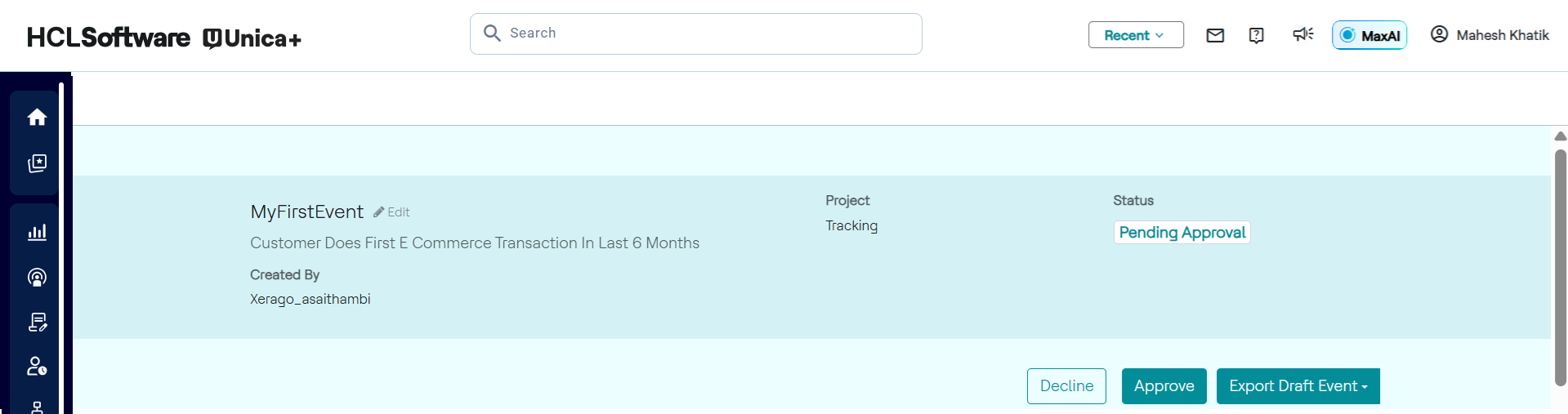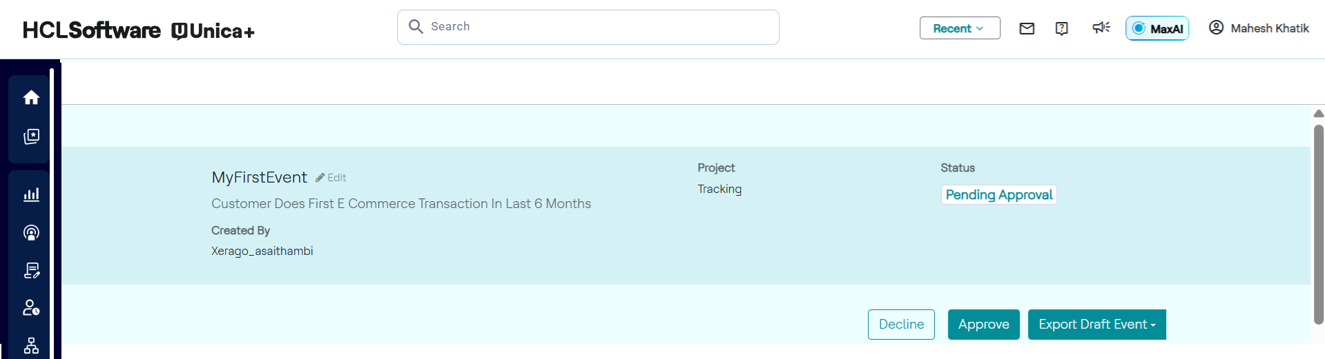 - Event status updates to Declined, allowing maker to revise and resubmit. Example: A checker reviews a draft for a "Referral bonus campaign," updates the start date, and deploys it. If declined, feedback is shared with the maker for correction.