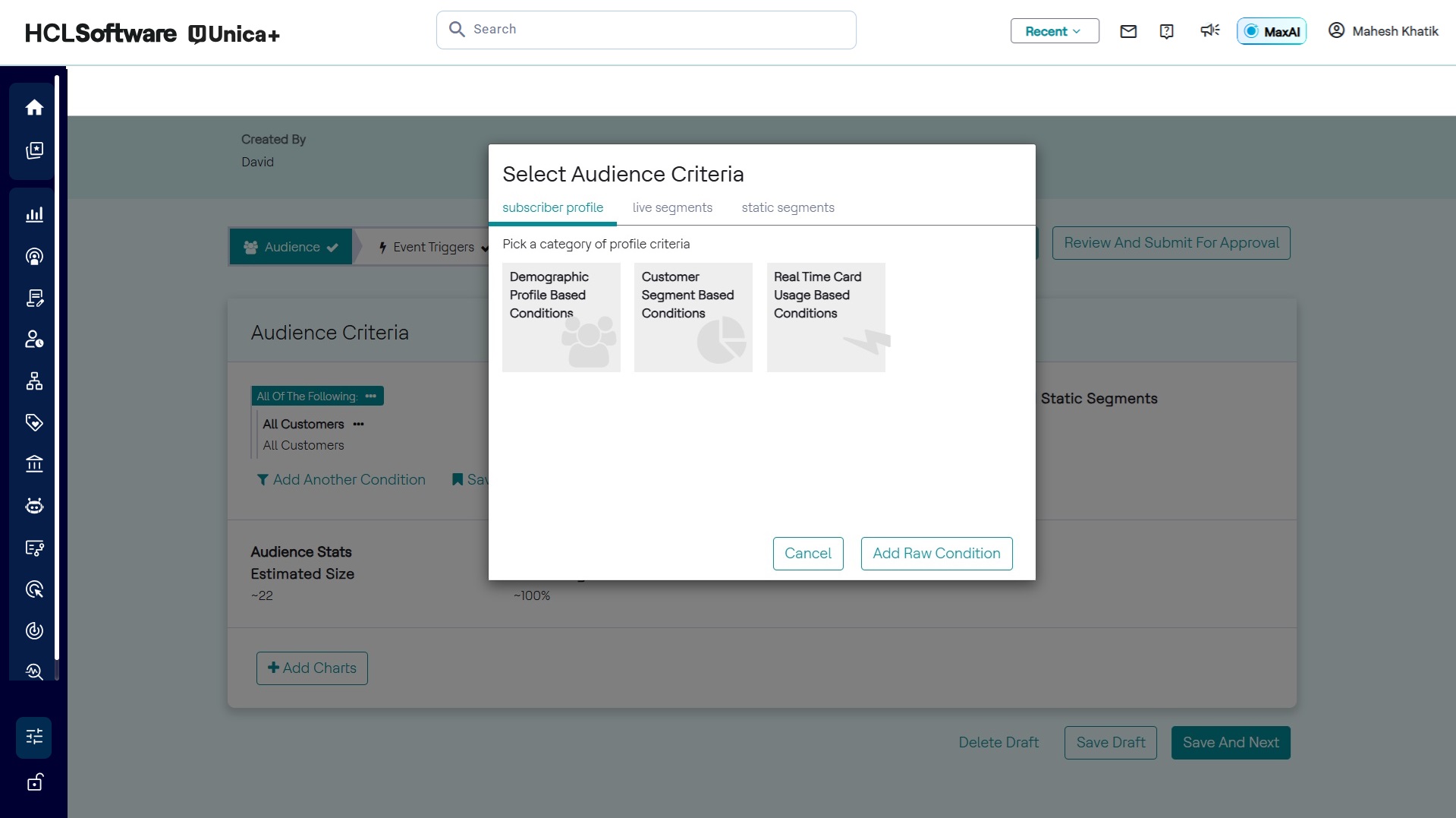 Under Audience Stats, the Estimated Size shows the number of customers who have satisfied the audience conditions, or audience size. The Percentage of Total Subscriber Base being targeted is also shown. Click Save and Next to proceed. To delete or save the draft click those respective options.
