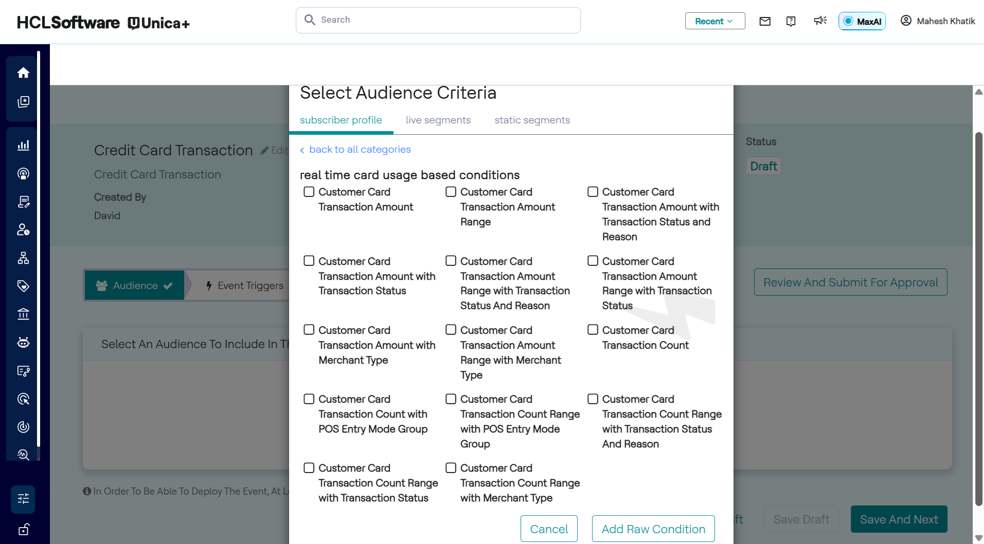 Set the audience conditions, as seen in the image below. These conditions determine the customers to target during the event.