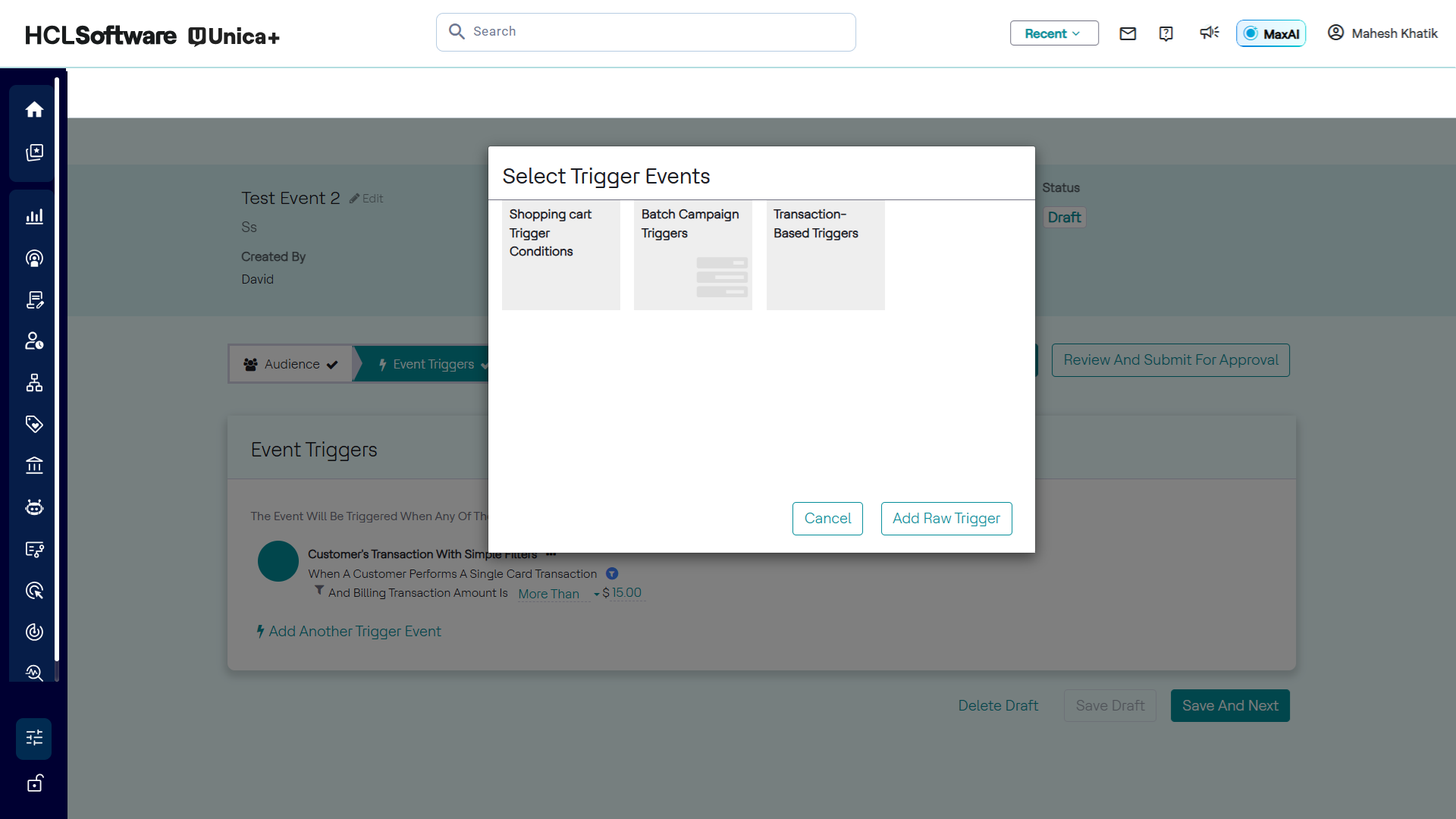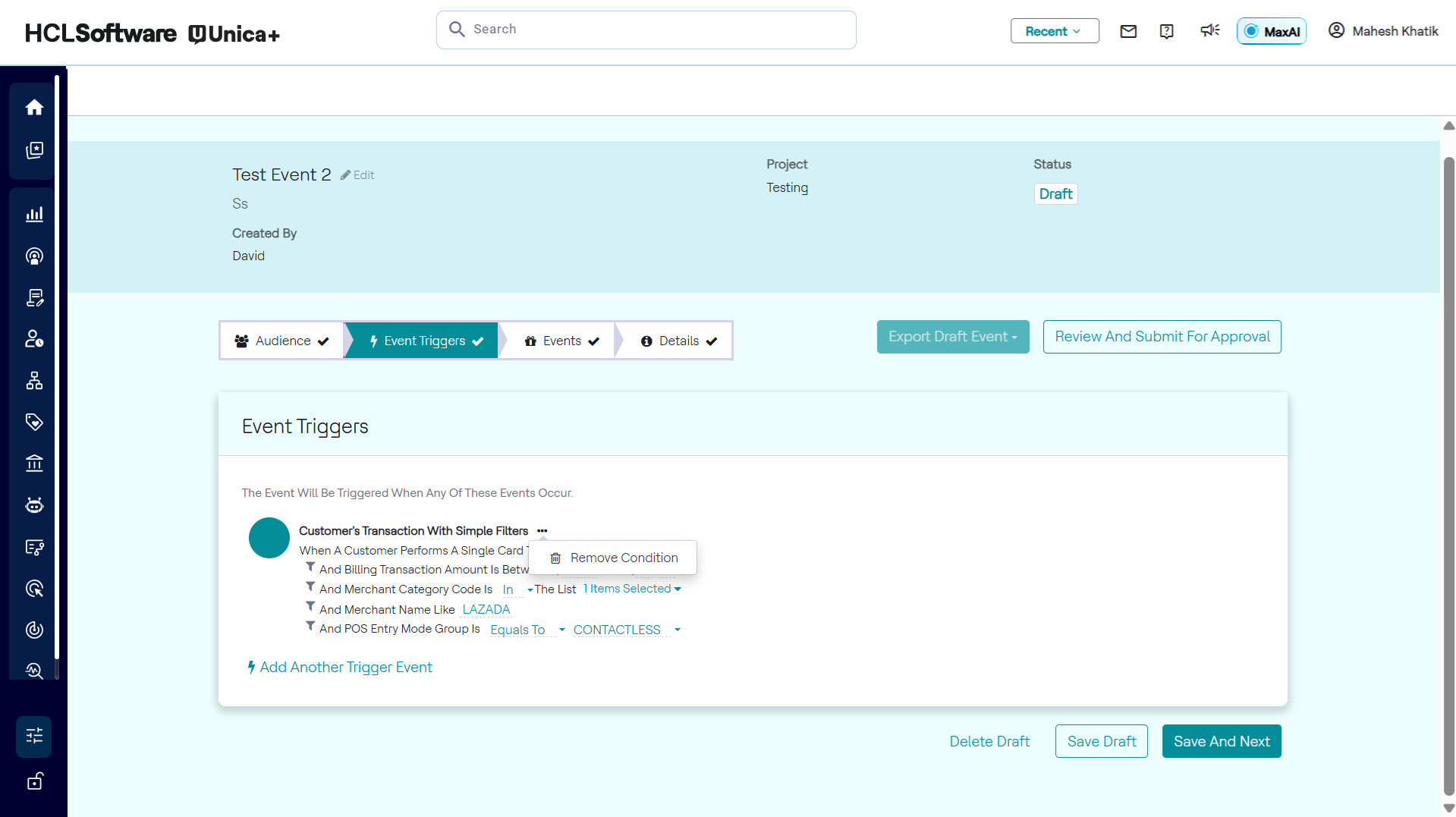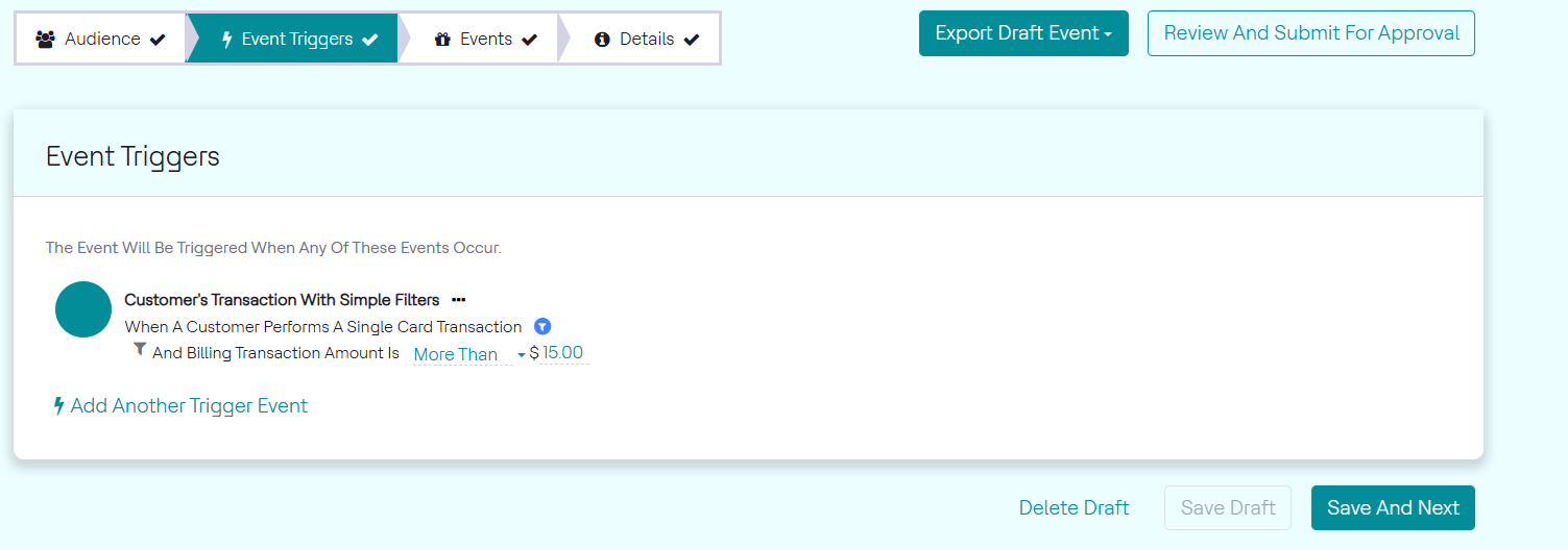 Set the trigger conditions, as seen in the image below. These conditions determine which customers have performed a transaction to trigger the event. The customers who satisfy both the audience conditions and the trigger conditions will qualify for the event. Once the simple transaction conditions are selected, combinations of filters can be selected via the filter icon.