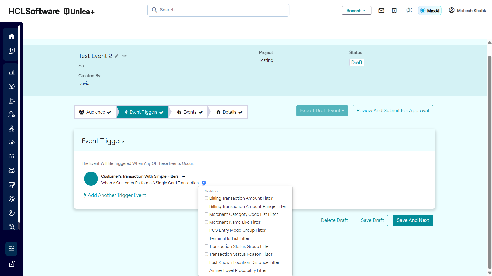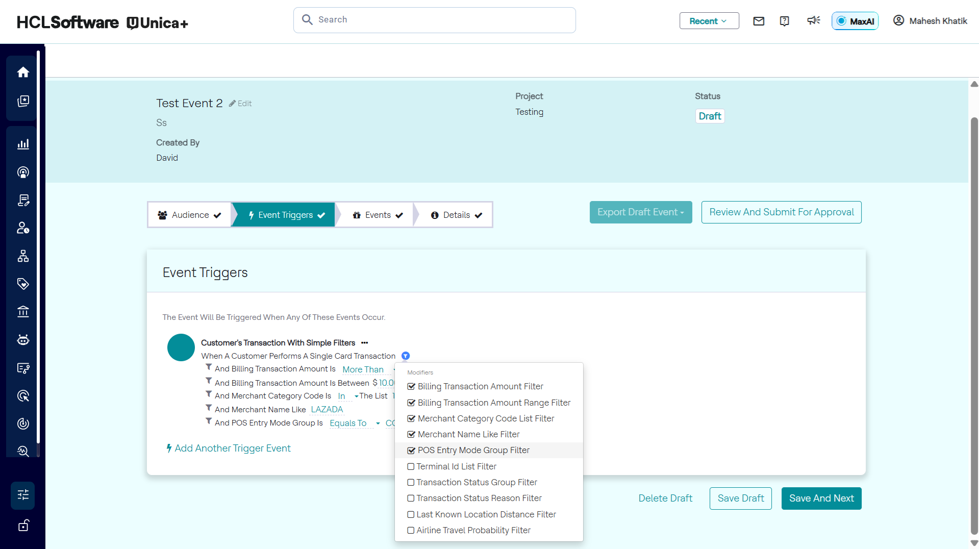 Modifiers can be selected or unselected by clicking the filter symbol beside the main trigger condition, as seen in the image below. This will show a checklist with a modifier that can be added in conjunction to the main filter selected. The user can also remove a selected modifier by clicking the cross icon beside its name.