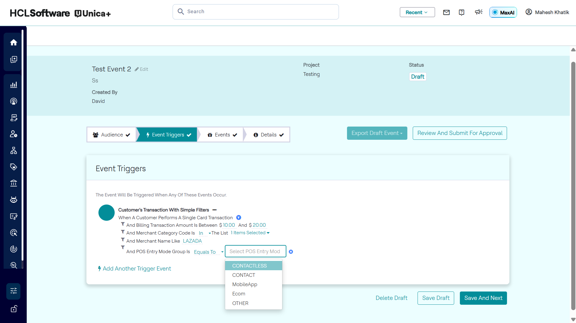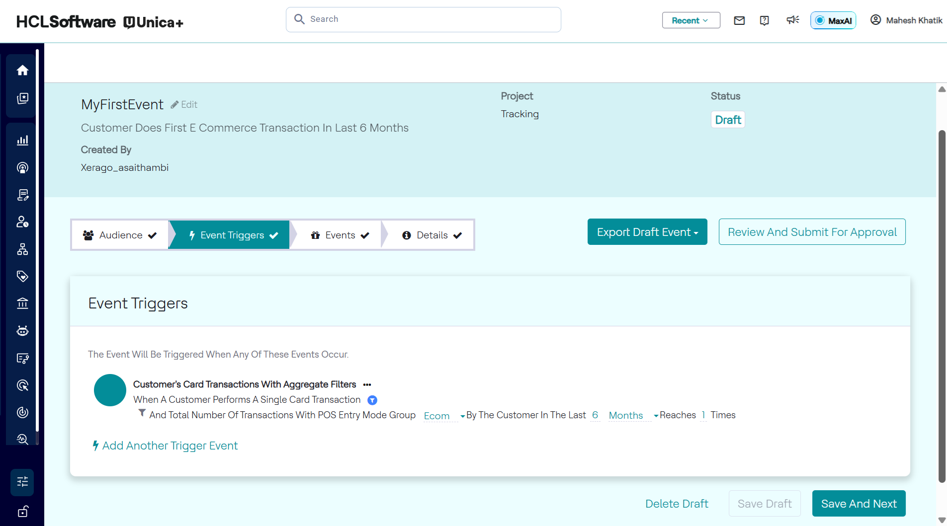 An event can be configured to detect an event based on time, count or amount thresholds on the customers transactions. These are applied once the customer fulfills the audience and trigger conditions. For this sample event, we will detect an event each time the customer fulfills the audience and trigger conditions.