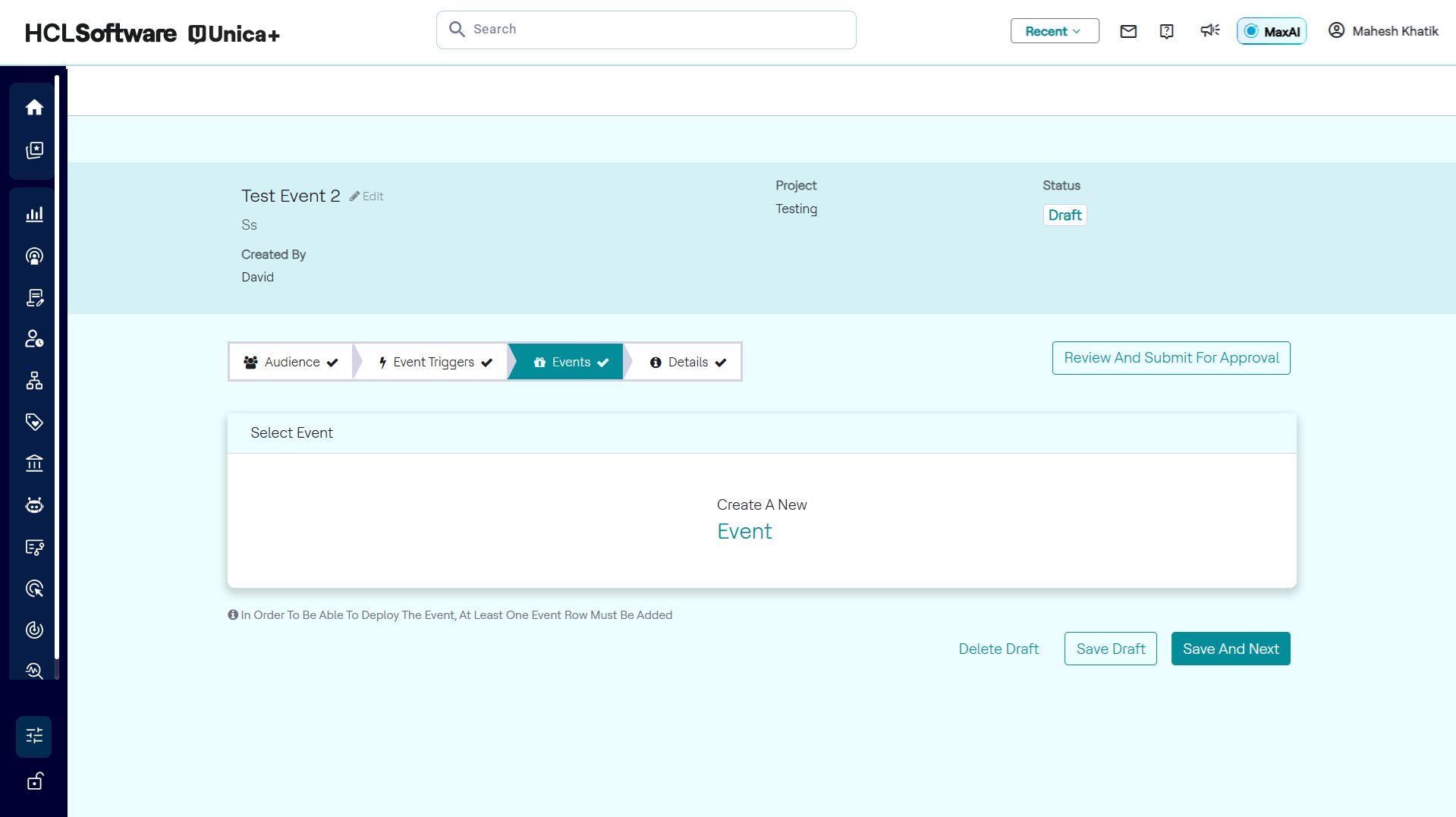 Once the event is edited and reviewed, Submit for Approval. This will usually be done from a Makers account. The image below shows the status once submitted, from a Checkers account. This will allow a Checker (or Admin) to review the event.