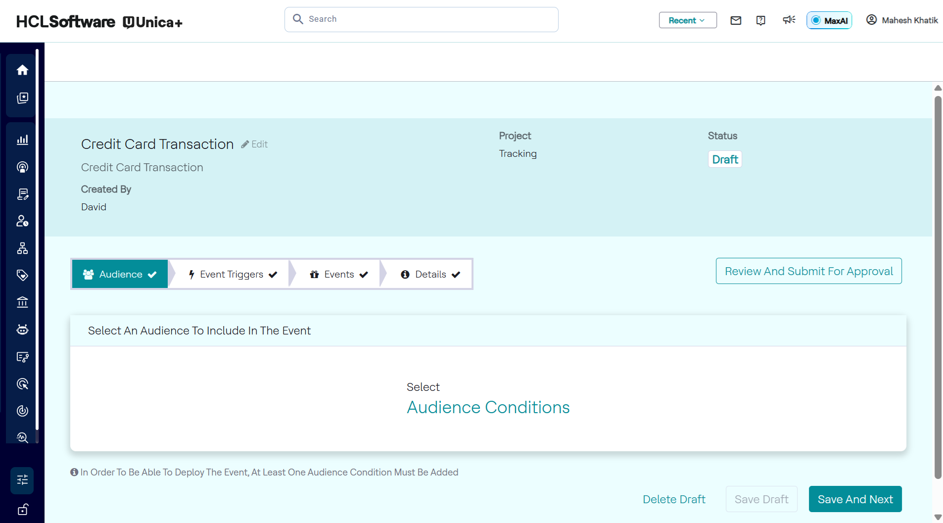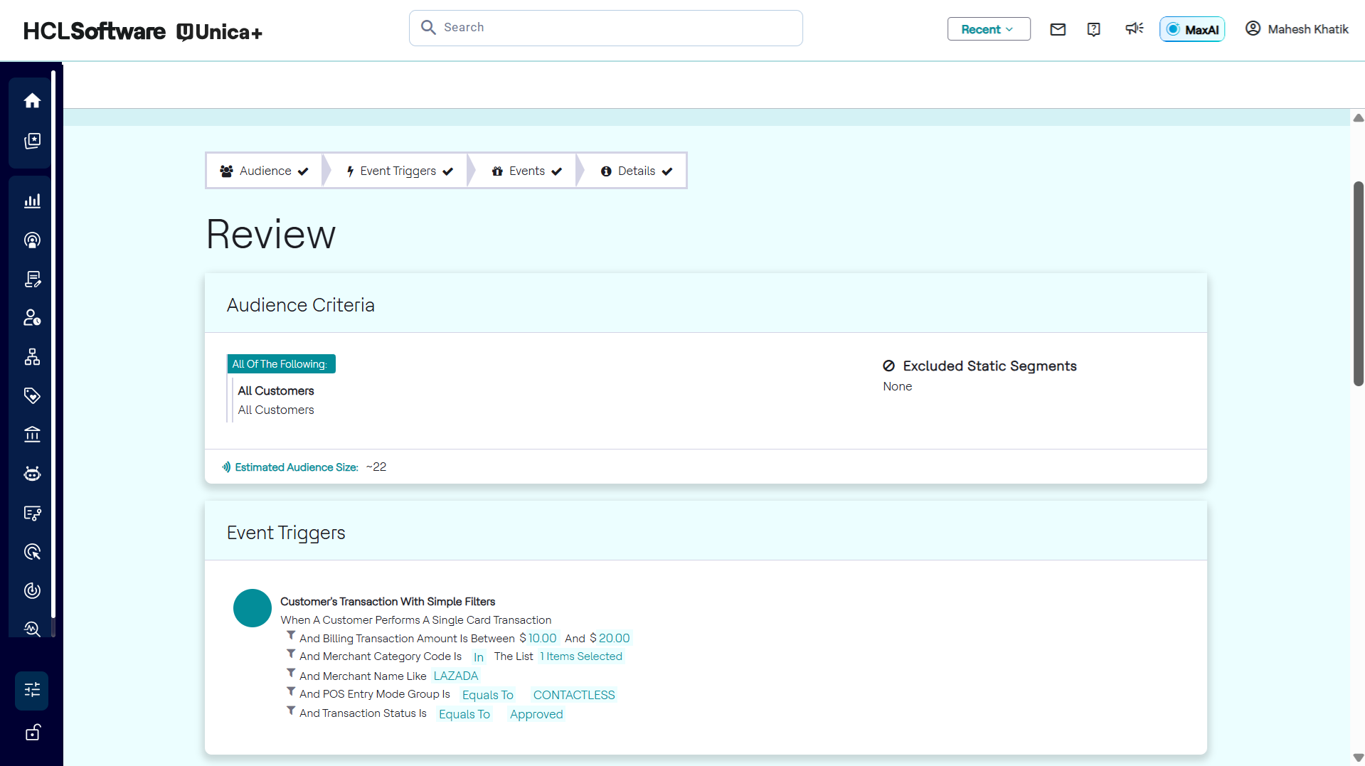 After proceeding from Details, a page will be displayed where the Audience, Triggers, Events and Details of the event can be reviewed. The images below show this.