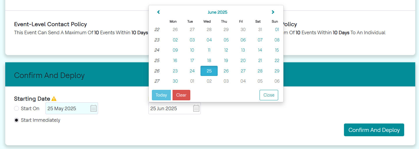 Review the details of the event and specify the dates the event will run. Click Submit for Approval. Once a Checker (or Admin) has reviewed and approved the event, they can select a time period for the duration of the event and deploy it as shown in the image below.